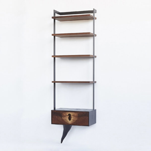 This wall unit typically includes a single opening and a single drawer with one sculptural element and four shelves. Each piece is made to order and is available in either white, black or custom colors. Custom sizes are available.