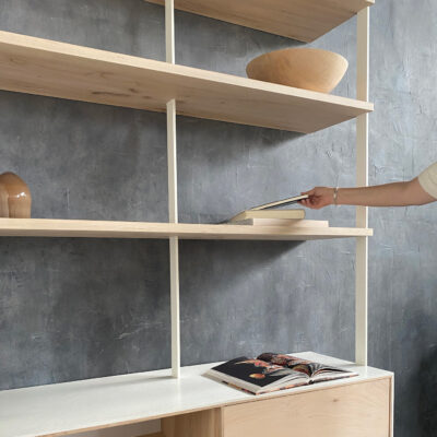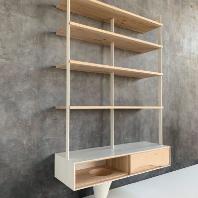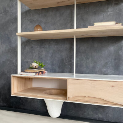 Wall unit in maple from the OUTSIDE IN Collection. Encased with a white pigmented and waxed concrete surround.