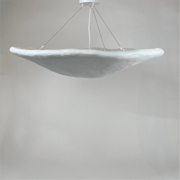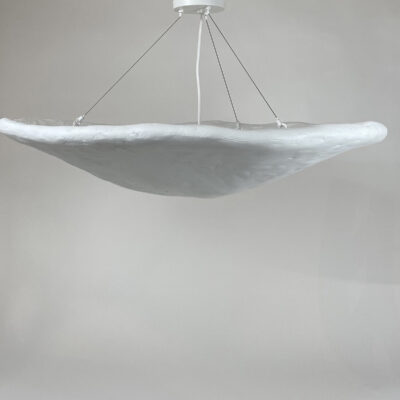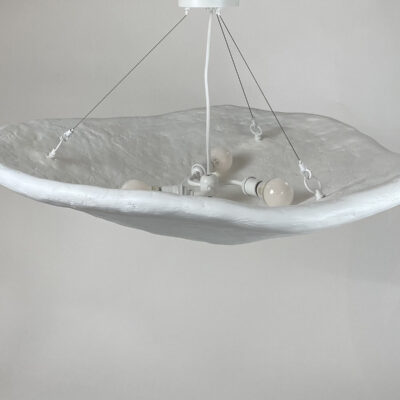 Inspired by oyster and scallop shells, the Oyster Pendant explores the juxtaposition between raw material and beauty. These pieces are composed of plaster, paper pulp, and steel and come in perforated or smooth shells. Every size can be used as a flush mount pendant or can be hung with blackened brass chain for a more elongated chandelier. Each piece is unique and made to order and is available in either stark white or custom colors.