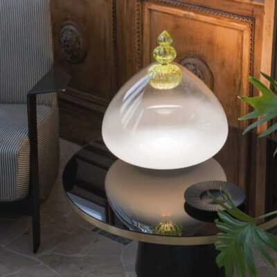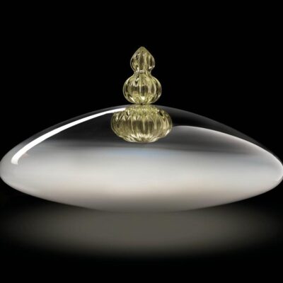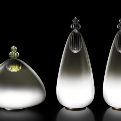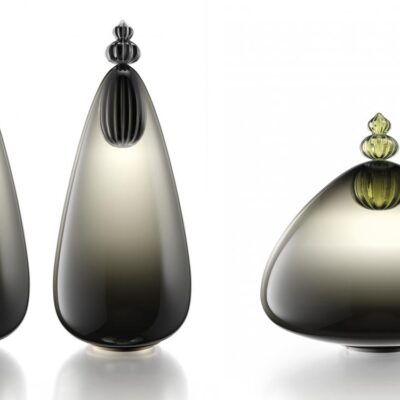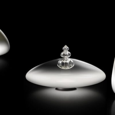 This collection is designed to express harmony, a synthesis of parts, a synergy of contrasts. The external ampoule has a very clean design, made in a single blowing, and a gradually shaded colour, produced by the skillful gesture of the artisan. The other parts, finely crafted with the typical Murano ribbing technique, have complex, sophisticated forms.