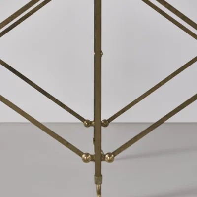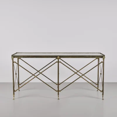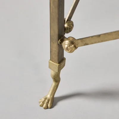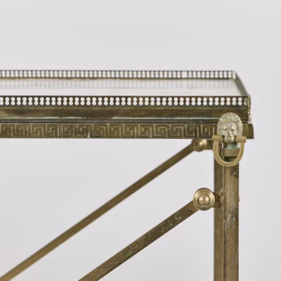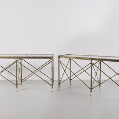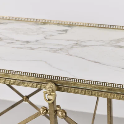 Elegant pair of Directoire-style brass console tables with marble tops and gallery edge.