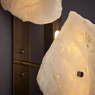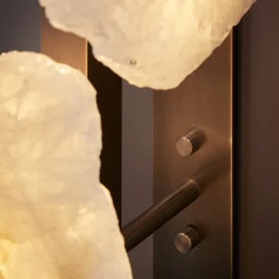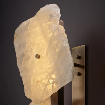 A hand-finished brass rod suspends the studio’s signature quartz ‘slices’ in three directions, offering a sculptural array illuminated with light. Each piece embodies an individual stone biography, the resonance of formation made visible by the stone’s variance in colouration, transparency and natural veining.