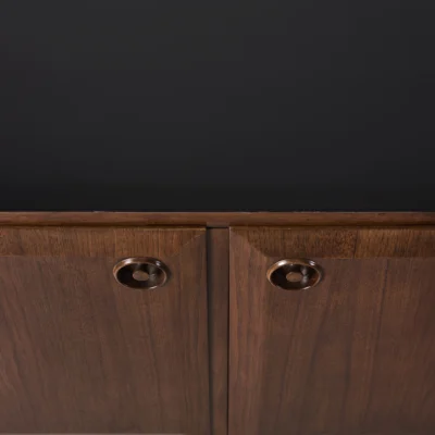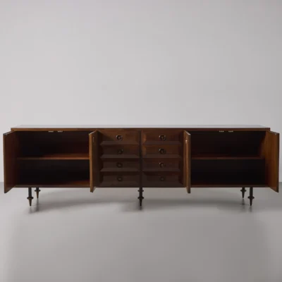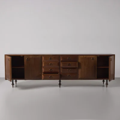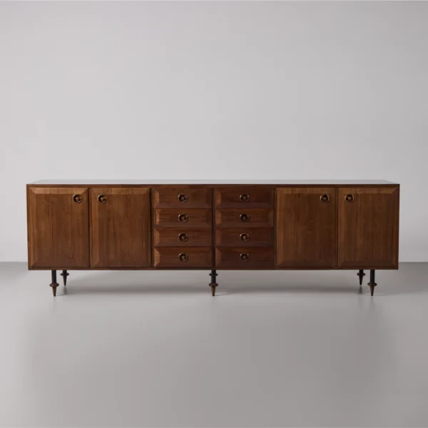Paneled credenza, four-door, eight-drawer walnut credenza on tapering toupie feet.