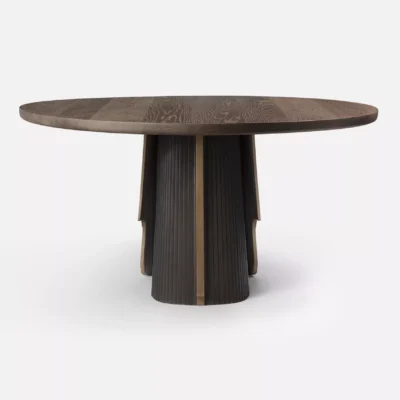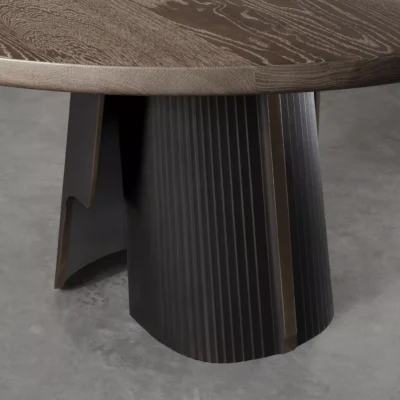 The Promontory Dining Table is comprised of a solid oak or walnut top with a cast bronze base of two asymmetrical shield-like forms. Available as custom in both single or double-pedestal configurations.