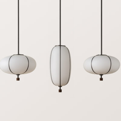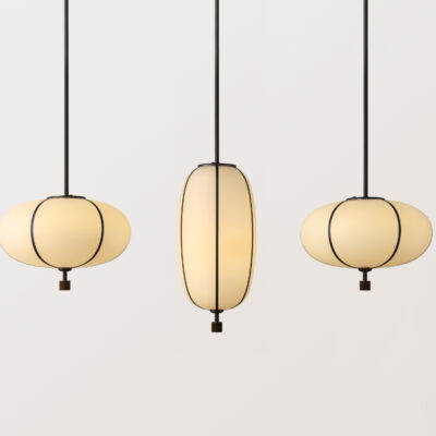 The Rib Pendants are available in three shapes and ve sizes, designed to stand alone or in various grouped arrangements. Each glass pendant is blown in Italy and delicately framed by thin brass ribs. A cylindrical brass finial, with optional hand-wrapped leather or suede, elongates the pendant and adds a finishing touch of refinement.