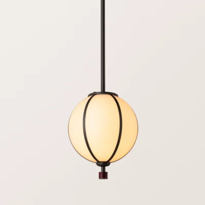 The Rib Pendants are available in three shapes and ve sizes, designed to stand alone or in various grouped arrangements. Each glass pendant is blown in Italy and delicately framed by thin brass ribs. A cylindrical brass finial, with optional hand-wrapped leather or suede, elongates the pendant and adds a finishing touch of refinement.