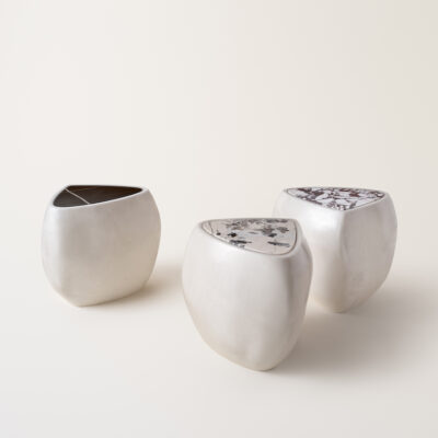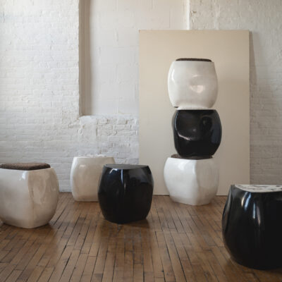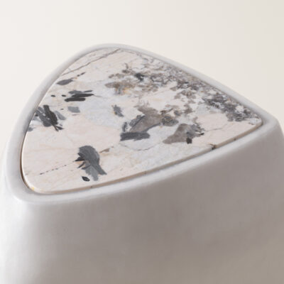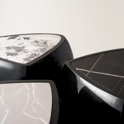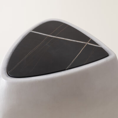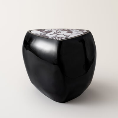 Inspired by stones shaped and polished by ever-evolving bodies of water, the River Side Table presents a sculptural, asymmetrical form made up of so curves and lines. e table is expertly made by handlayering berglass and gel coat over several days, evoking a sense of fuidity on a solid form. An inset piece of marble serves as a table surface and a complementary pairing. Available in an opaque black high gloss nish, matte black nish, or in a uniquely formulated cream nish combining both opaque and translucent movement. Made by hand in Pennsylvania.