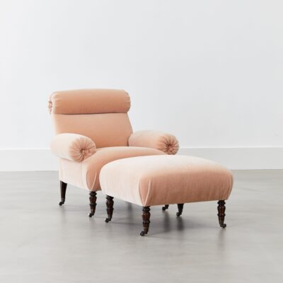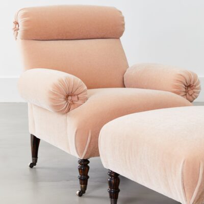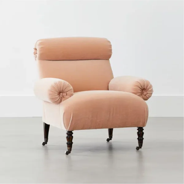 Upholstered arm chair with rounded head and arm rests, rosette details and turned legs on casters.