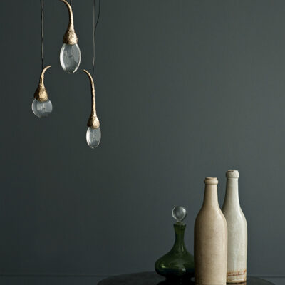Installation with solid cast bronze buds in polished bronze or satin nickel finish, each housing a glass drop illuminated by LED.