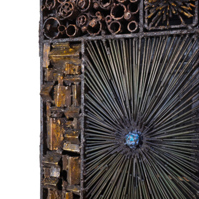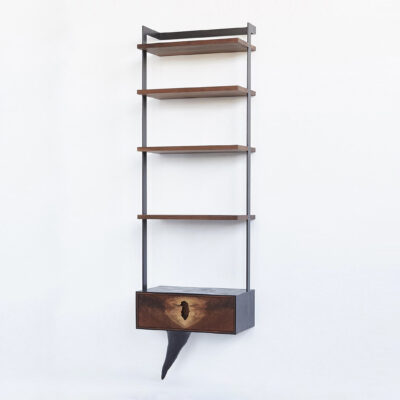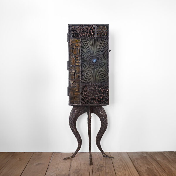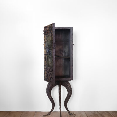 United States Contemporary Blackened steel, fused bronze, copper, enamel single door cabinet on 'animal' legs. Dimensions: 18" W x 11.5" D x 61.5" H Item Number: CG-XX-0523-01 Price: Upon Request