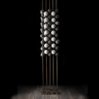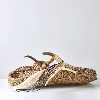Basket made of natural seagrass and reed with leather, pyrite, and waxed co on thread accents with a horsehair tassel and a shed elk antler.