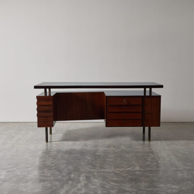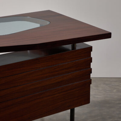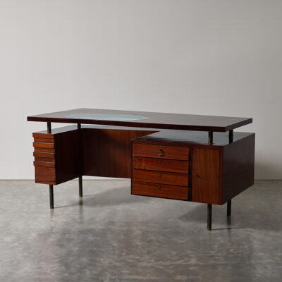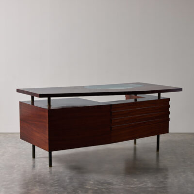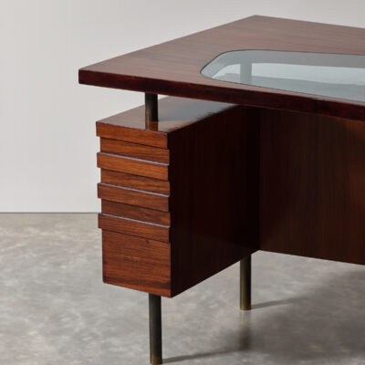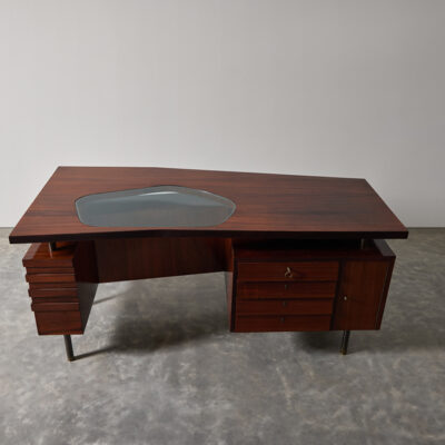 Floating top walnut desk with glass panel insert, four drawers and hinged door compartments on brass legs.