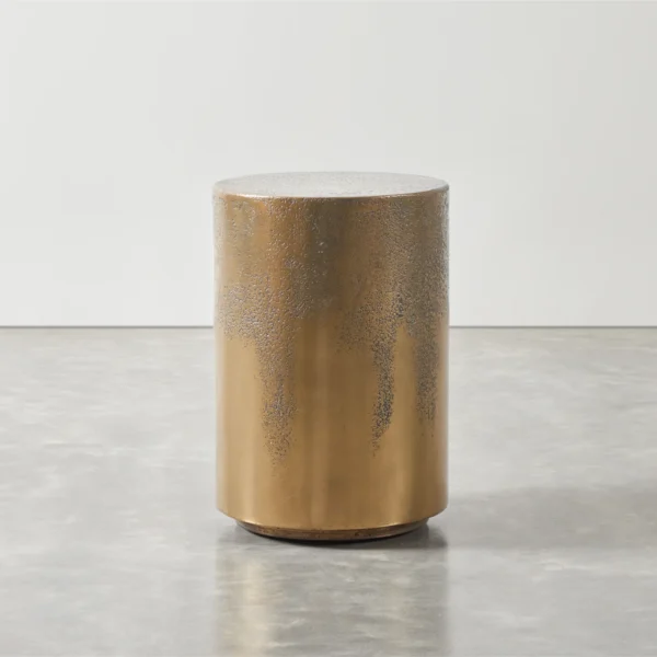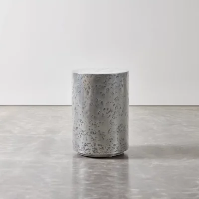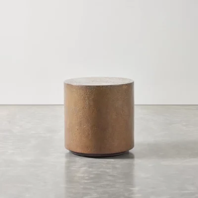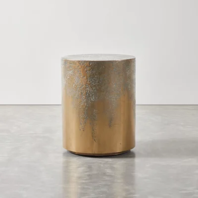Iconic drum shape, hand-applied lacquered resin finish in multiple metal finishes and textures. The resin lacquer is atomized with real metals and will and and patina over time creating a warm finish.