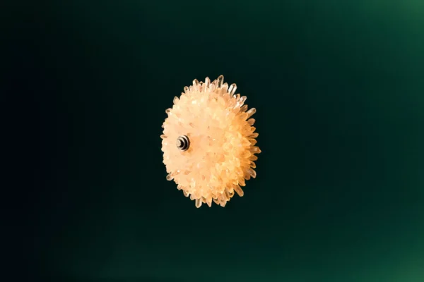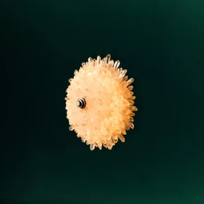 Akin to an antique hand-blown glass chandelier in its scale, craftsmanship and intricacy, THEIA is conceived as a future heirloom standing the test of time. A hemispherical form, feathered in clear quartz crystals, rests beneath a translucent substrate, protecting the precious material and forging a striking silhouette.