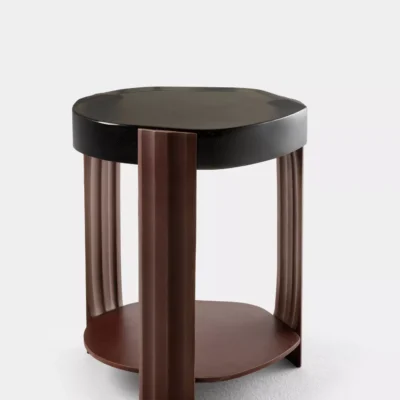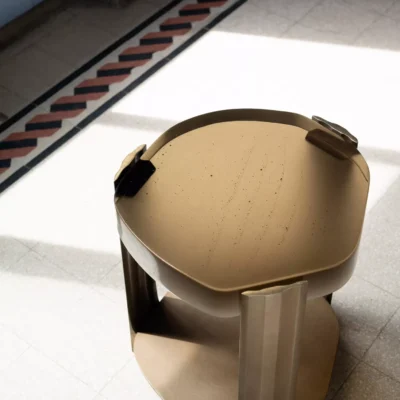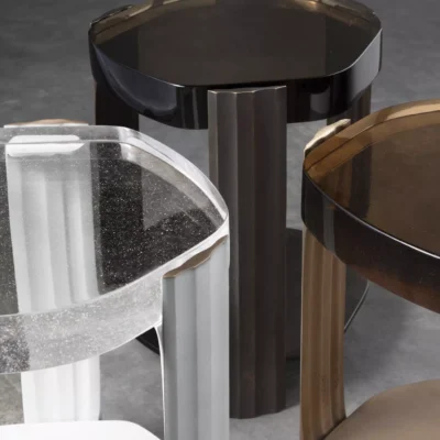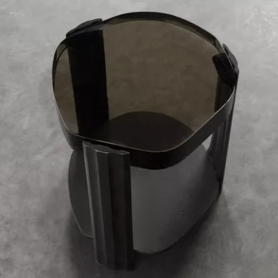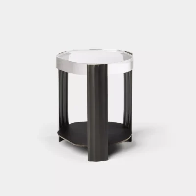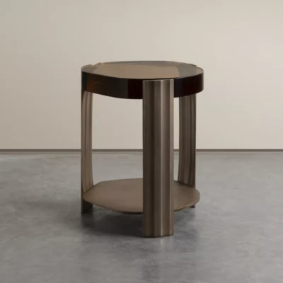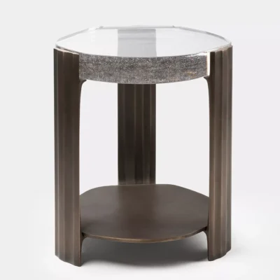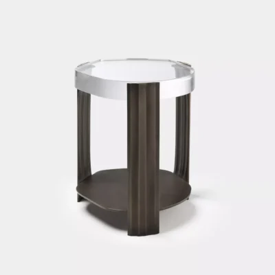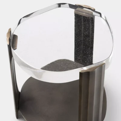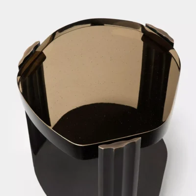 The Tributary motif is about headwaters and braided streams and also about the nature of tribute - the channeling of materials and processes into something contributory. The works are anchoring, monumental, and express movement between elements both navigable and rough, high plateaus and shallow estuaries. The Tributary Occasional Table is an exploration of planes, channels, and primary and secondary surfaces. The cast bronze frame and lower surface together support hand-polished kiln cast glass, solid oak, or black walnut. Dimensions: 17.5" Dia. x 21.5" H | Lower Top: 17.5” Dia. x 3.5” H Item Number: TS-R-TRB.OCT.01 Weight: 123 lbs Cast Bronze: Available in Collection Bronze Patinas. Cast Glass: Available in Collection Glass Colors. Price upon request.