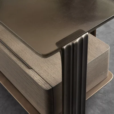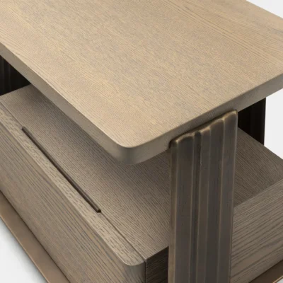 Tributary Side Table No. 2 is comprised of two substantial solid oak or walnut tops flanked by a pair of cast bronze uprights.