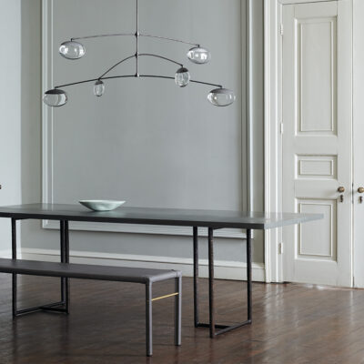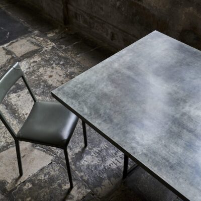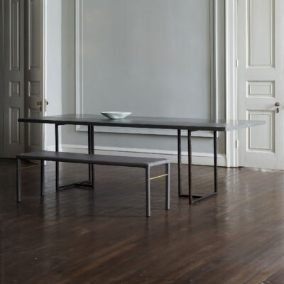 Pair of cast bronze and steel table bases in a dark patinated finish. Bases can be used with customer’s own table top. Zinc top can be made upon request.