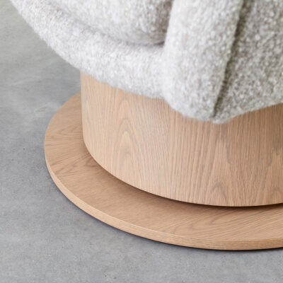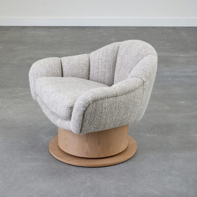 Channel tufted cushion or swivel base in metal or wood finish.