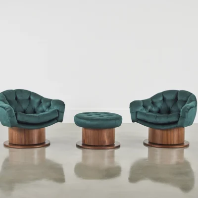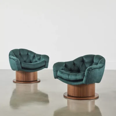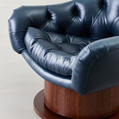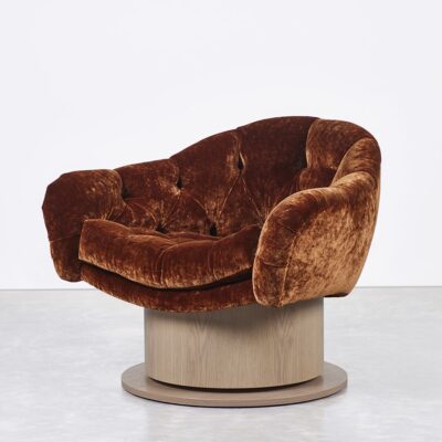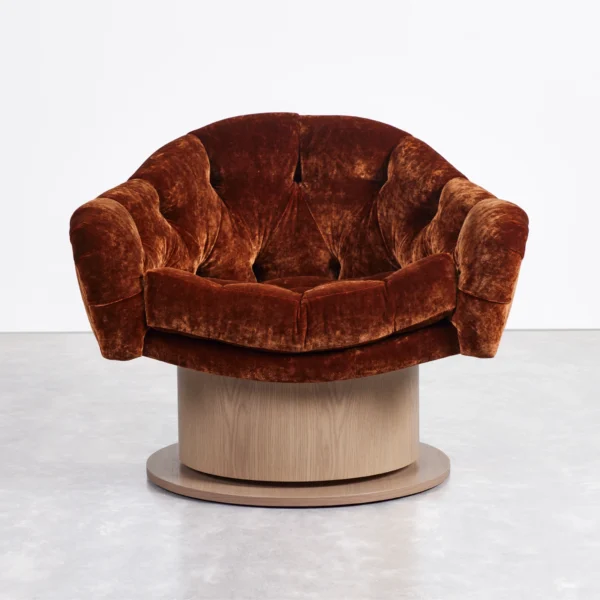Upholstered chair with tufted seat and cushion with brass or wood veneered swivel base.
