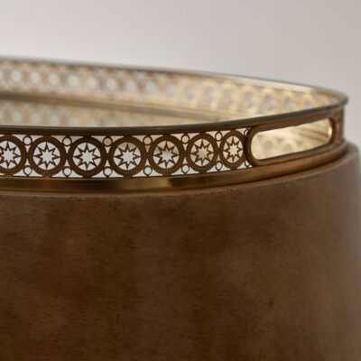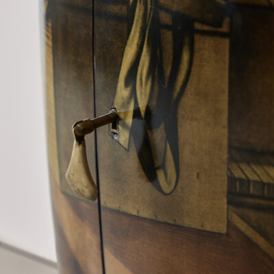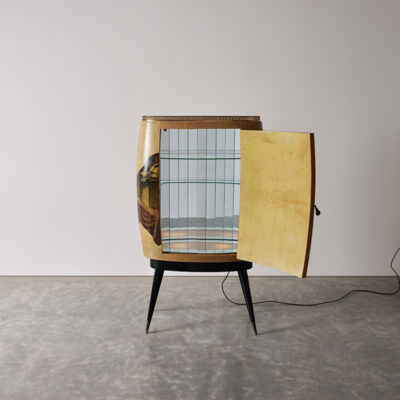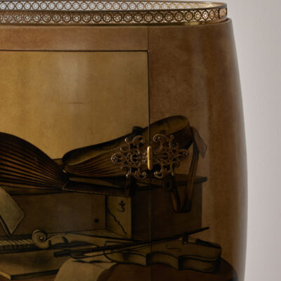 A very rare parchment clad bar cabinet with silk-screened musical themed decoration by Silvio Testi. The interior with mirrored and illuminated glass on splayed wood legs. Tura production label.