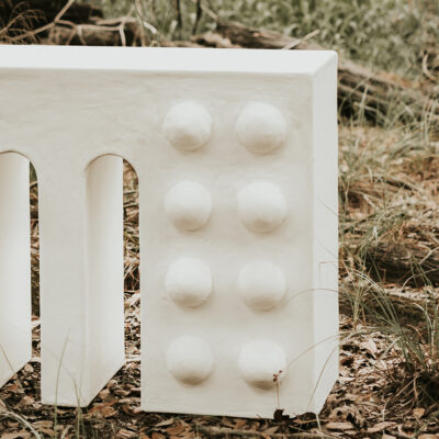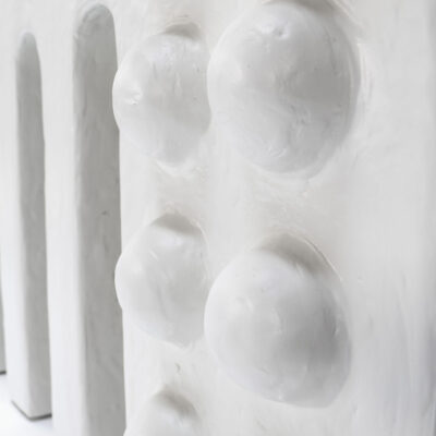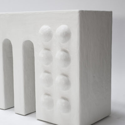 The Wendon Console Table is both functional and decorative, thanks to its solid yet harmonious silhouette and use of natural materials. Perfect for an entryway or dining room, the entire piece is covered in a complex plaster and paint mix and is supported by a wooden structure that comprises two monolithic bases centered by three arched legs. The plaster domed details nod to the prevalence of the sphere and arch in ancient Roman architecture. Each piece is made to order and is available in either stark white or custom colors.