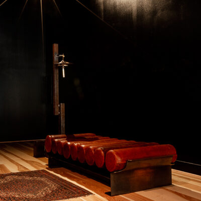 The Zhinu Day Bed is constructed of patinated bronze plated steel and American bison leather. Edition of 50 + 1 AP.