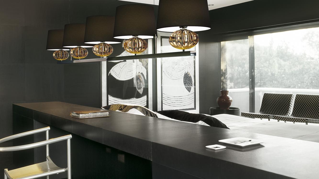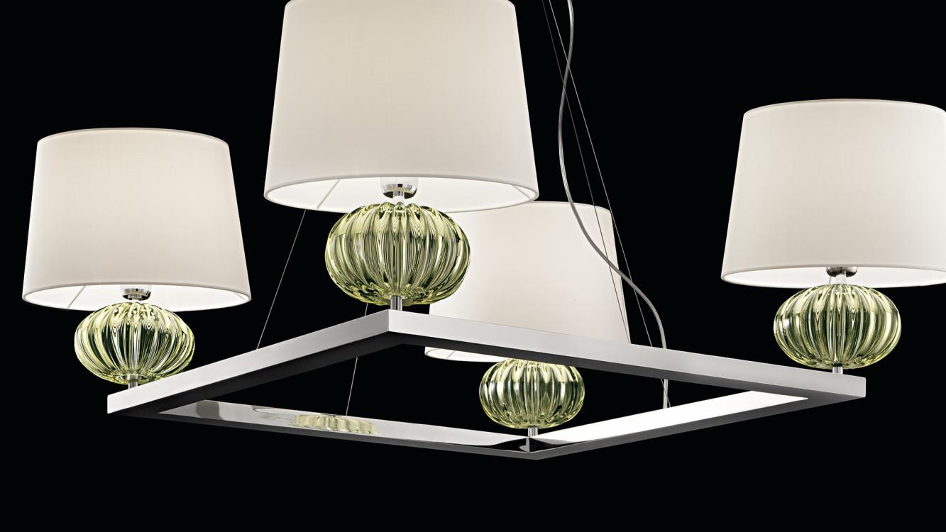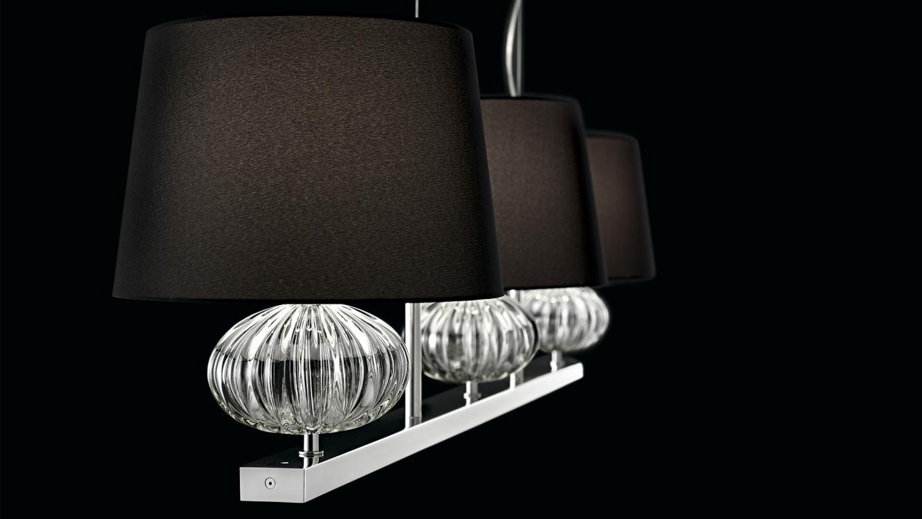 A suspension lamp featuring aligned spheres of Venetian crystal, crafted with the traditional “corteccia” technique. The hot glass is skillfully turned on a flat lamellar plate and then blown to obtain an irregular three-dimensional surface, resembling the bark of a tree.