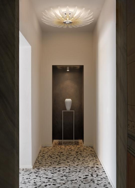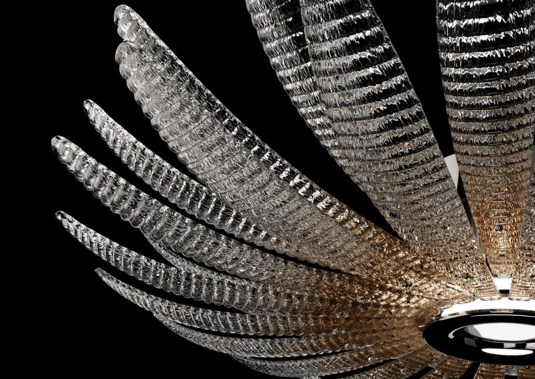 Agave is a collection inspired by the plant of the same name, a symbol of elegance and resilience, reinterpreted in Venetian crystal by designers García Cumini. Its iconic elongated leaf recalls Barovier&Toso’s glassmaking tradition and is enriched by the dew technique, which enhances its brilliance and three-dimensional texture. An innovative shaded effect, obtained with coloured glass beads, further enhances the design. This workmanship diffuses light dynamically, evoking the sun’s rays filtered through the agave leaves.