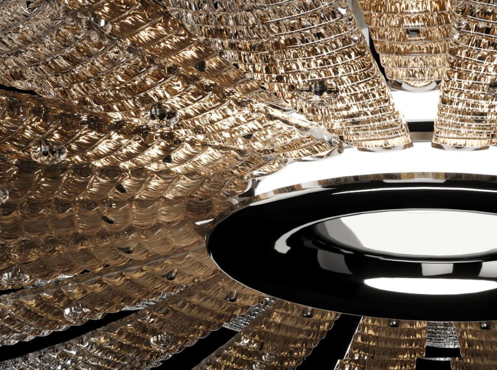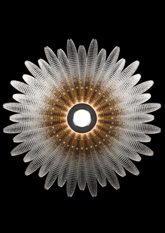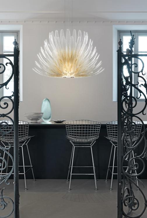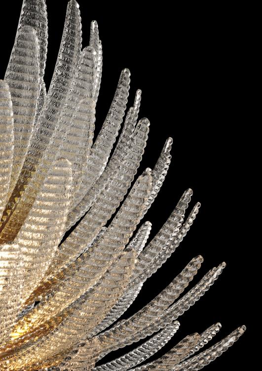 Agave is a collection inspired by the plant of the same name, a symbol of elegance and resilience, reinterpreted in Venetian crystal by designers García Cumini. Its iconic elongated leaf recalls Barovier&Toso’s glassmaking tradition and is enriched by the dew technique, which enhances its brilliance and three-dimensional texture. An innovative shaded effect, obtained with coloured glass beads, further enhances the design. This workmanship diffuses light dynamically, evoking the sun’s rays filtered through the agave leaves.