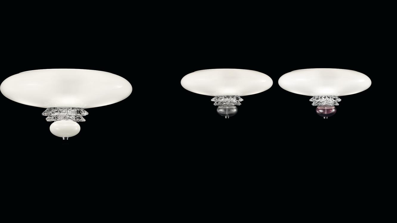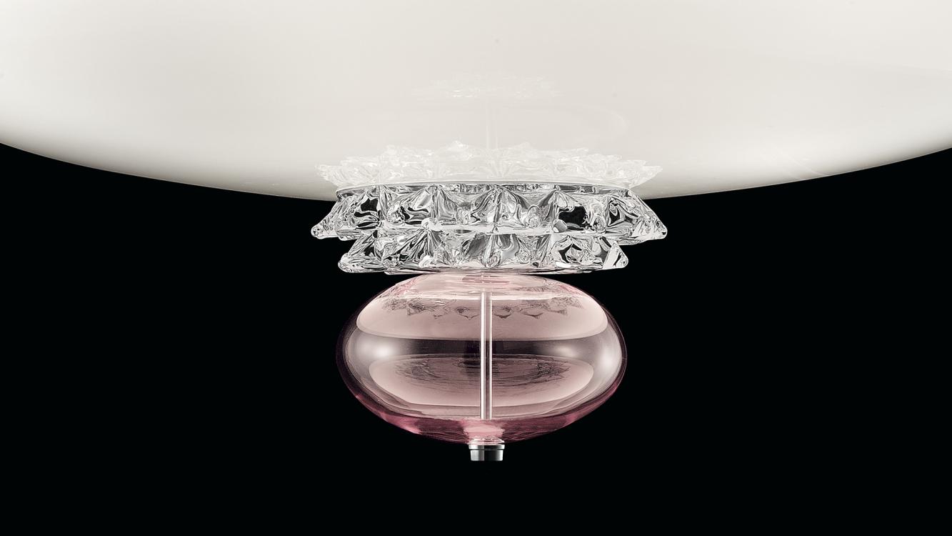 This ceiling lamp borrows the characteristic “rostrato” element from two highly successful collections, Amsterdam, and Rotterdam, combining it with the white diffuser and the Venetian crystal in muted colors of the decorative nose cone.