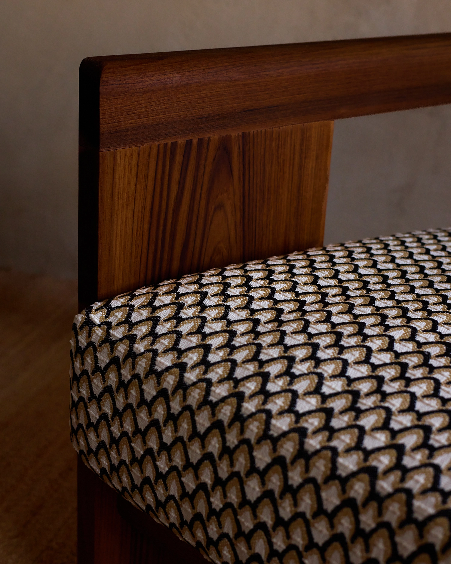 Materials: Teak, Upholstery Fabric, Natural Oil & Wax Finish