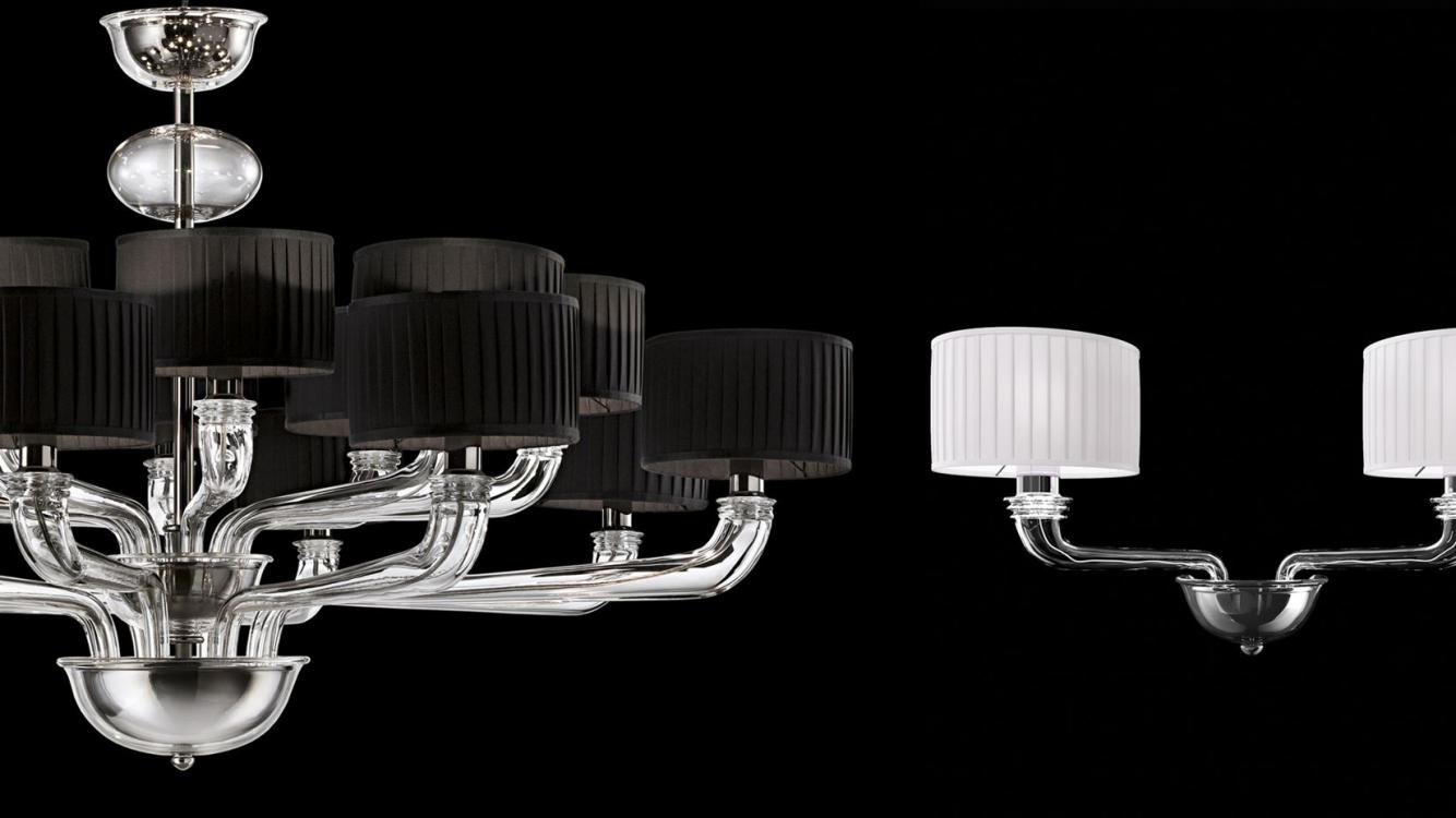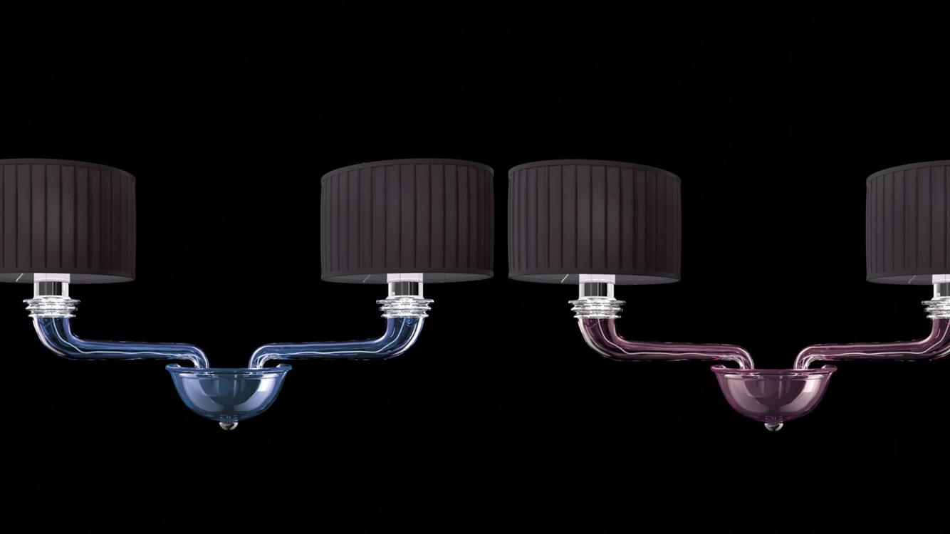 The two lights wall lamp completes the Babylon chandelier collection. Clean lines and pleated fabric lampshades allow to insert this product in any interior design project.
