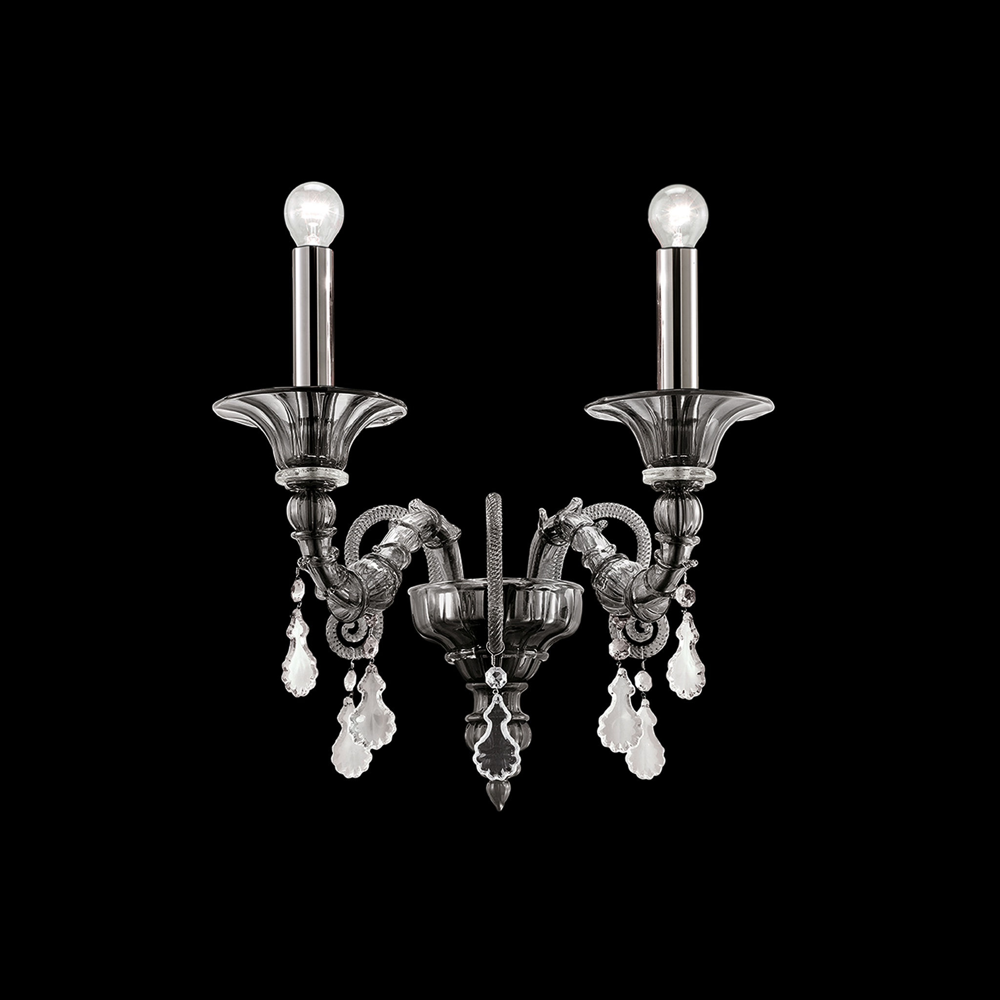 A two light wall sconce with a Baroque accent. Rich in precious details like pendants, pastorals and bobeches that add regal majesty, making the object the absolute protagonist of the space.