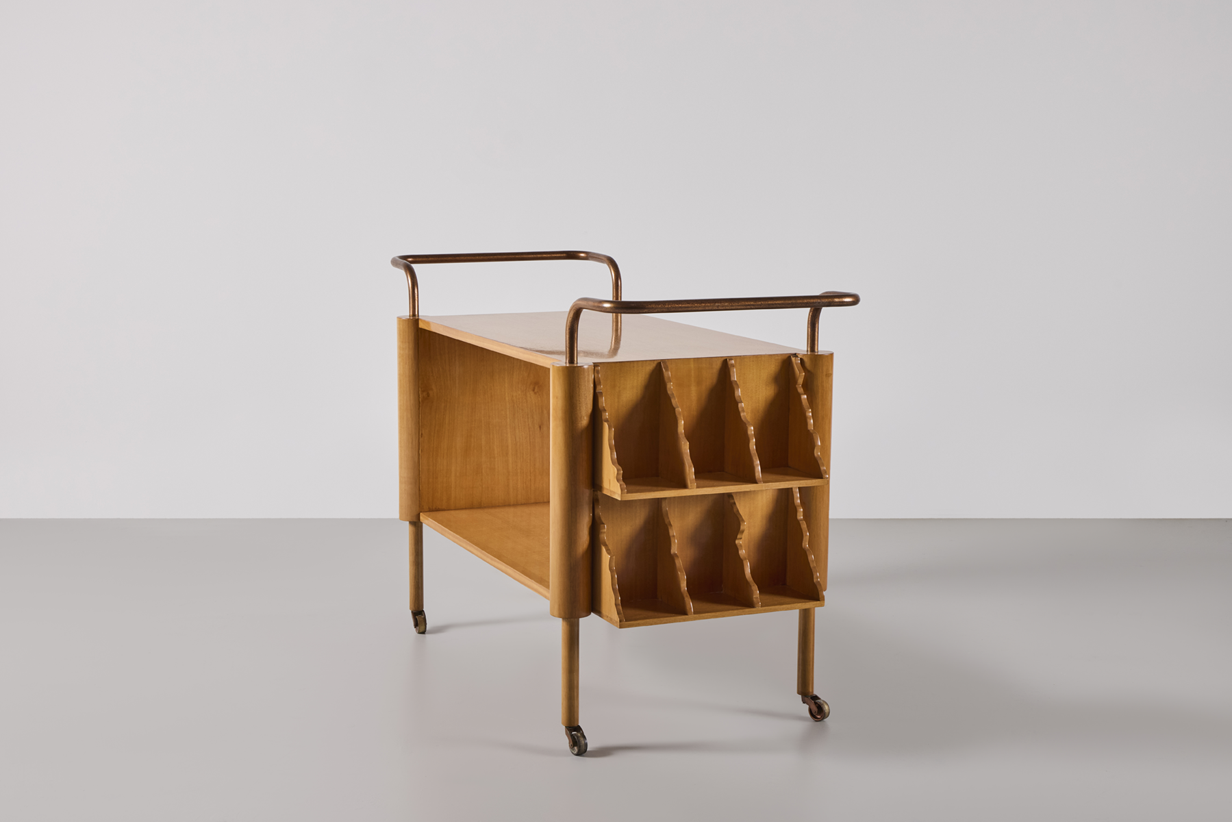 Bleached walnut two-tiered bar trolly with scalloped segmented bottle racks on brass casters.