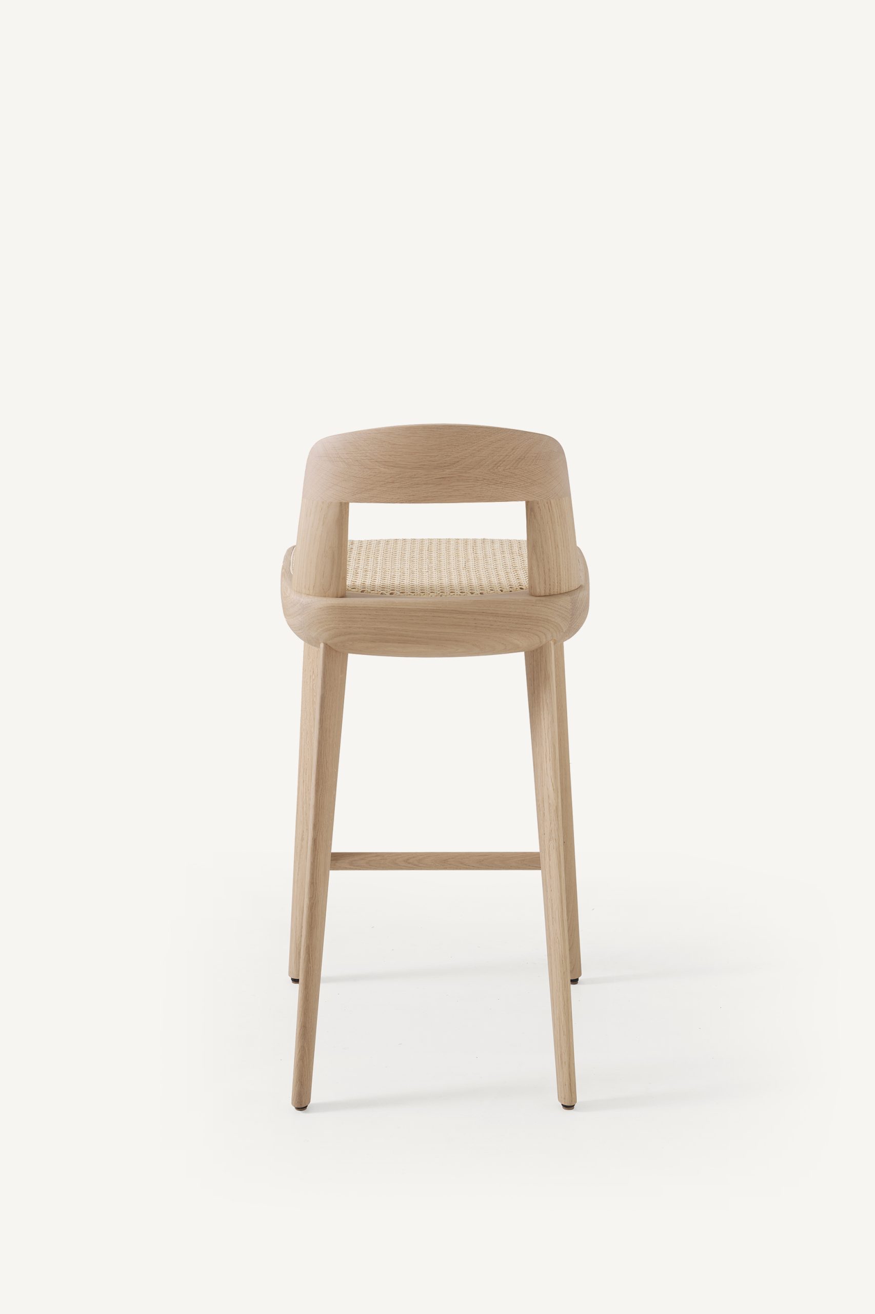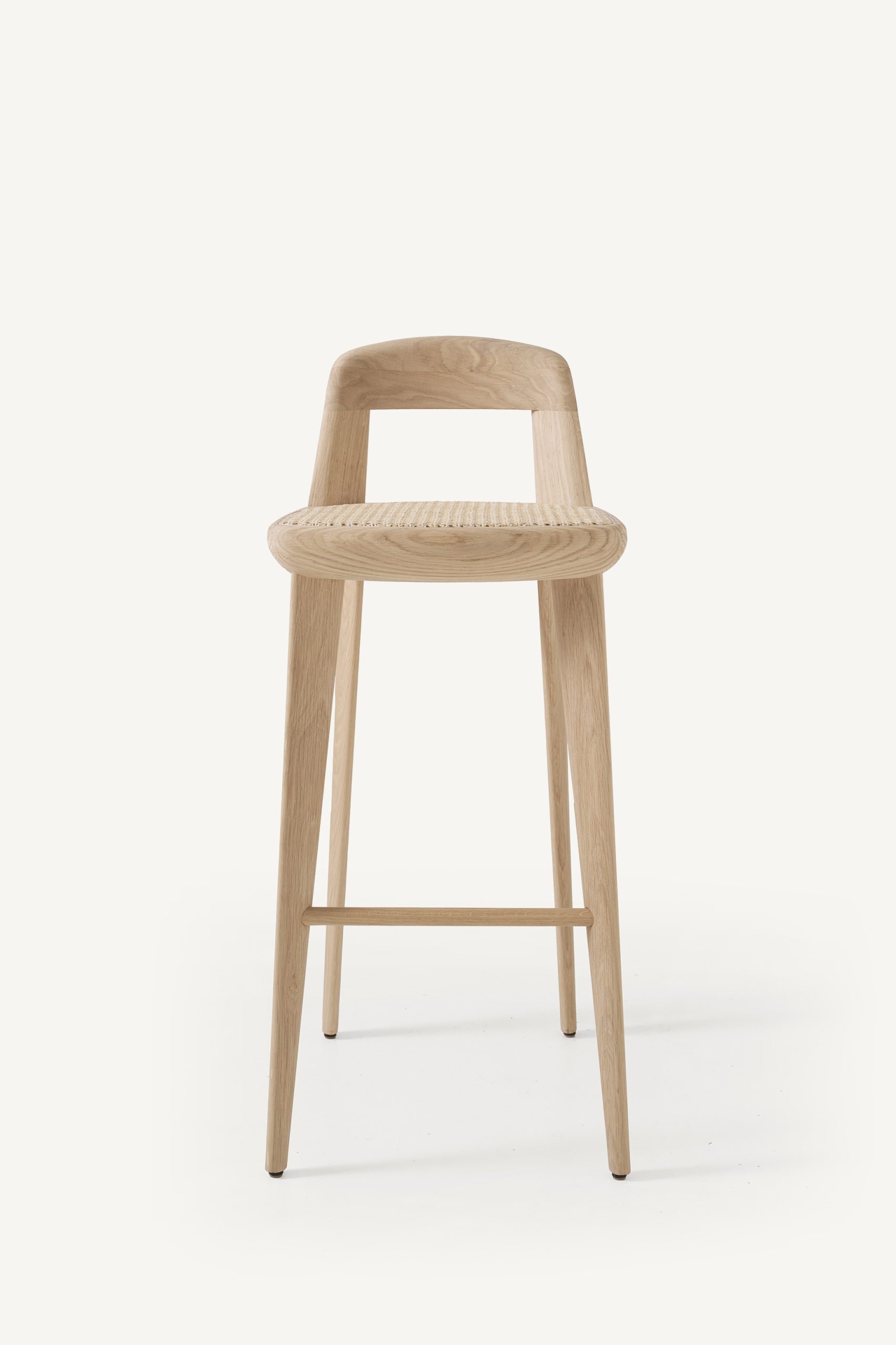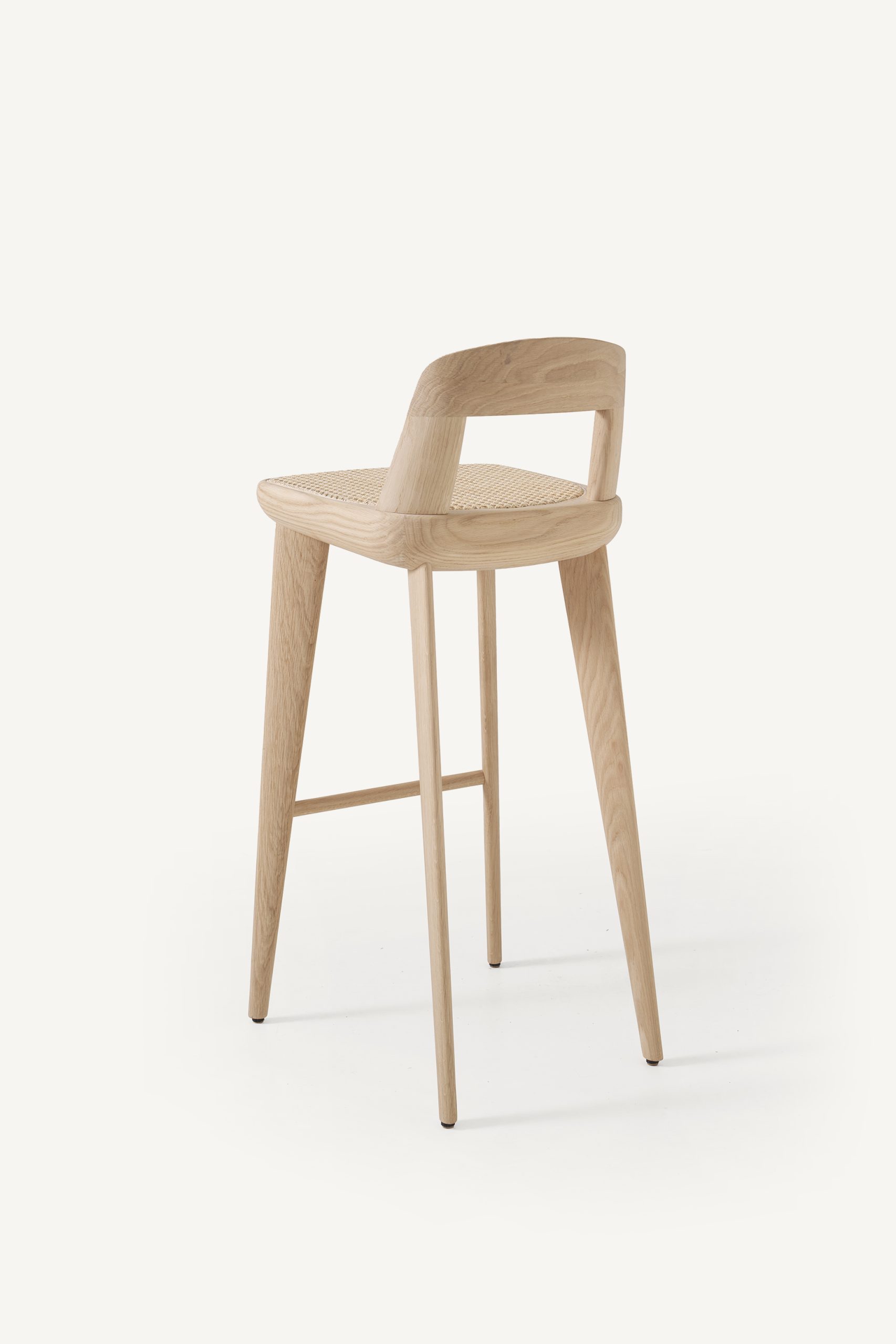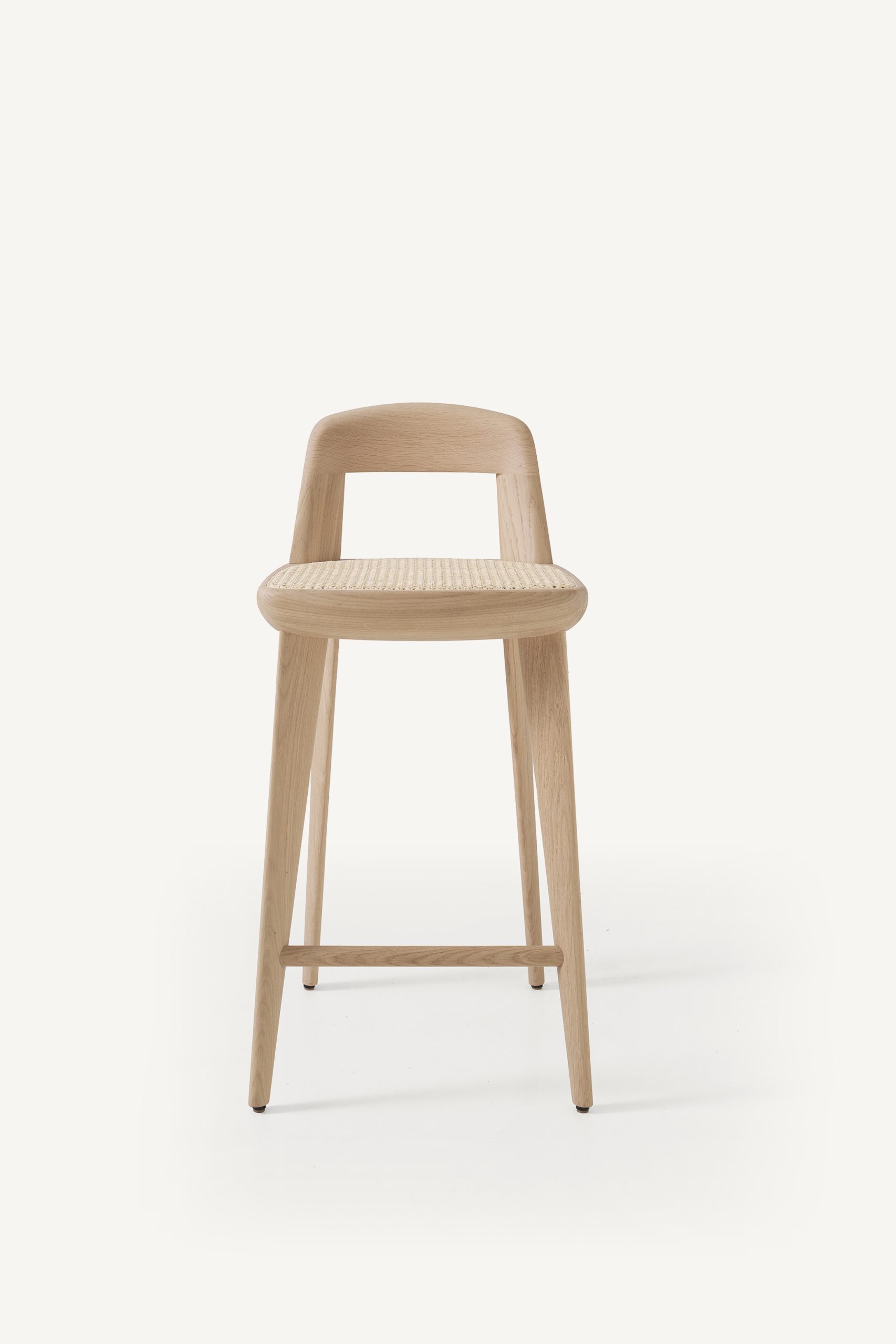 Brutus is intended to look more cut than constructed, as if it has been weathered naturally over time and then manipulated into a single sculptural element. Both the Armchair and Armless Chair versions possess certain aspects of the muscular vernacular of their Brutalist roots, but add smoothness and lightness. The Counter and Bar Stools feature the same construction details with a smaller proportioned seat and lower back. The option of Vienna caning on the seat pays homage to some of our favorite designs from the 1950s, while the upholstered version has a butter- soft leather pad with suspension webbing for maximum comfort. Each Brutus features the same style of elliptical legs which appear broad from one perspective, remarkably thin from another – similar to a shark’s fin.