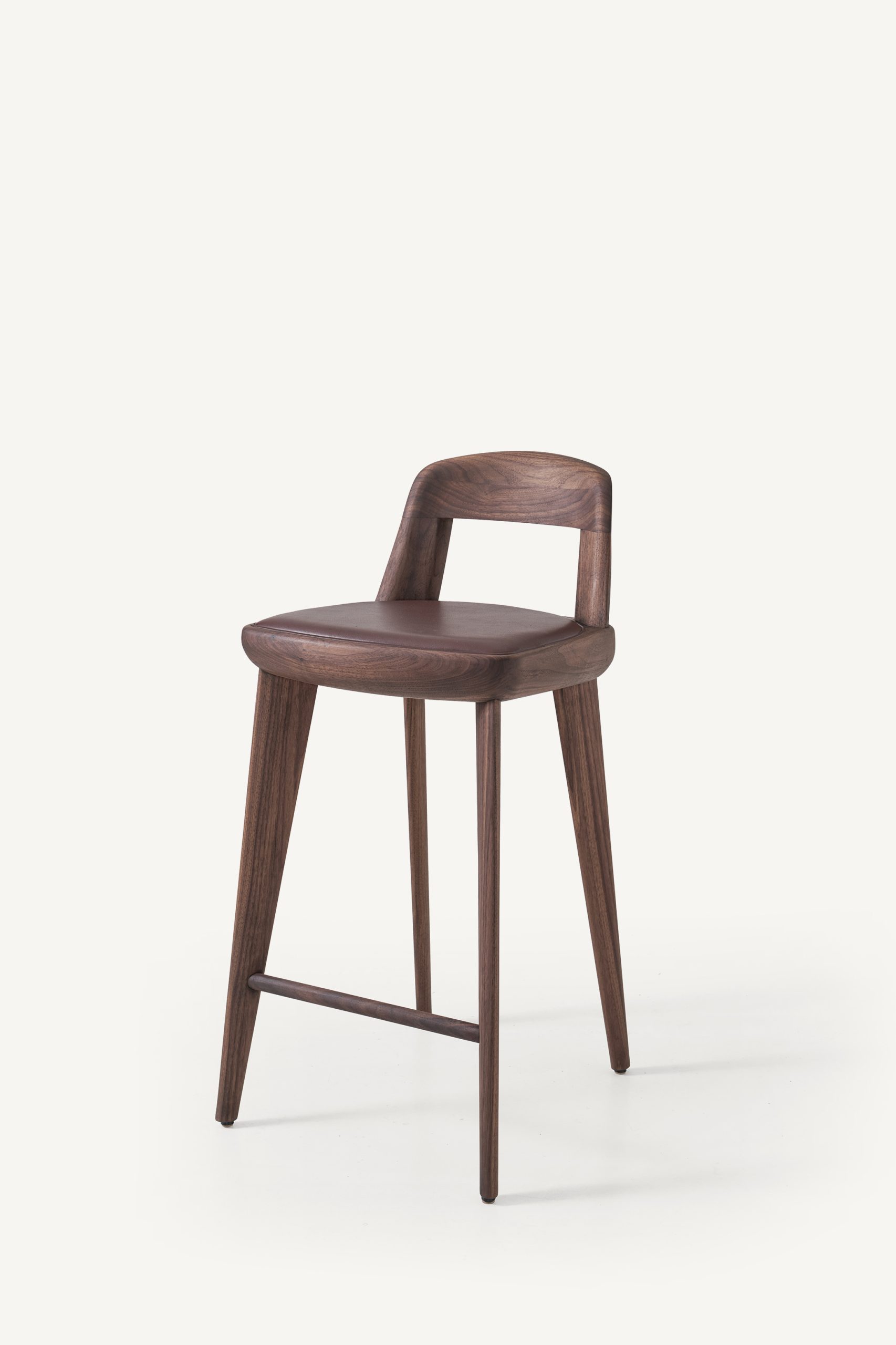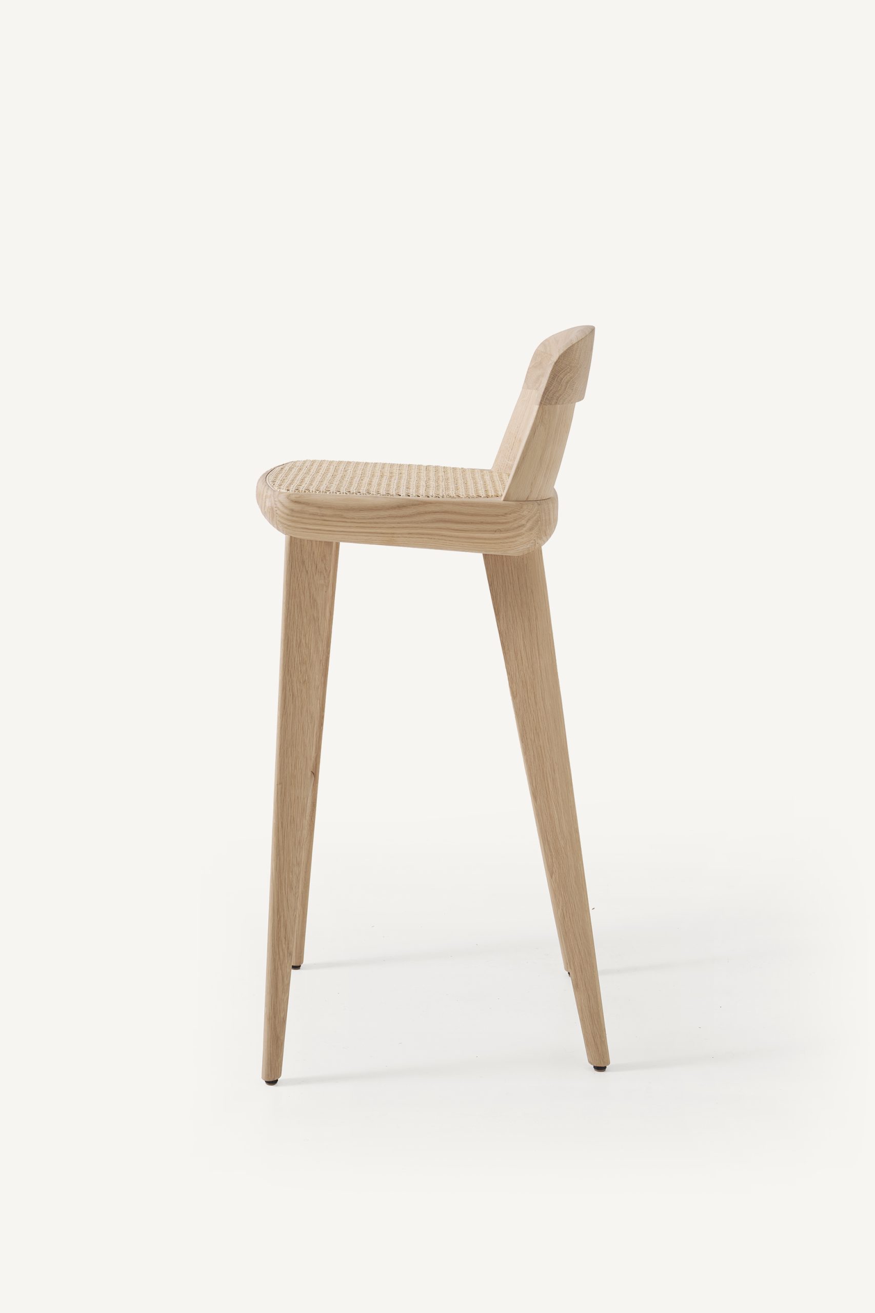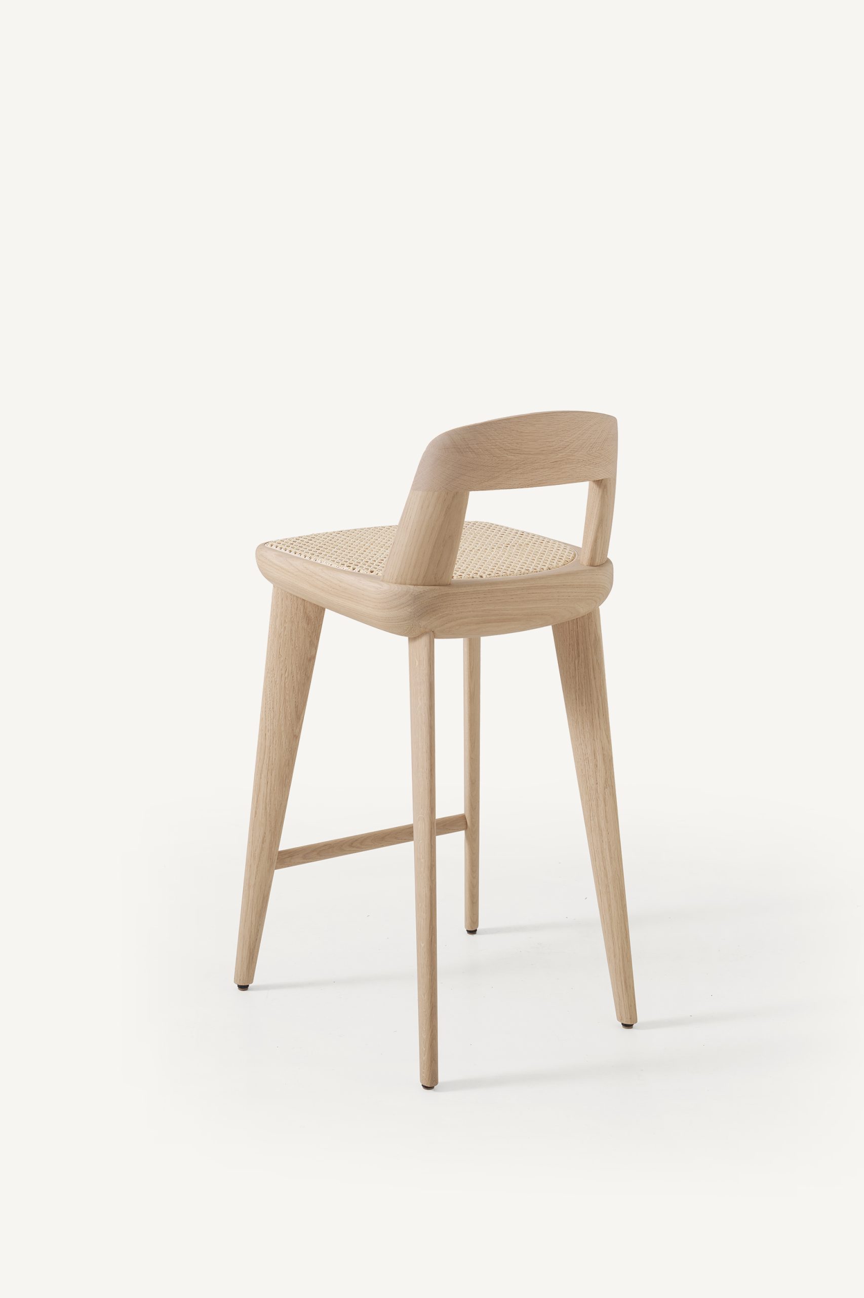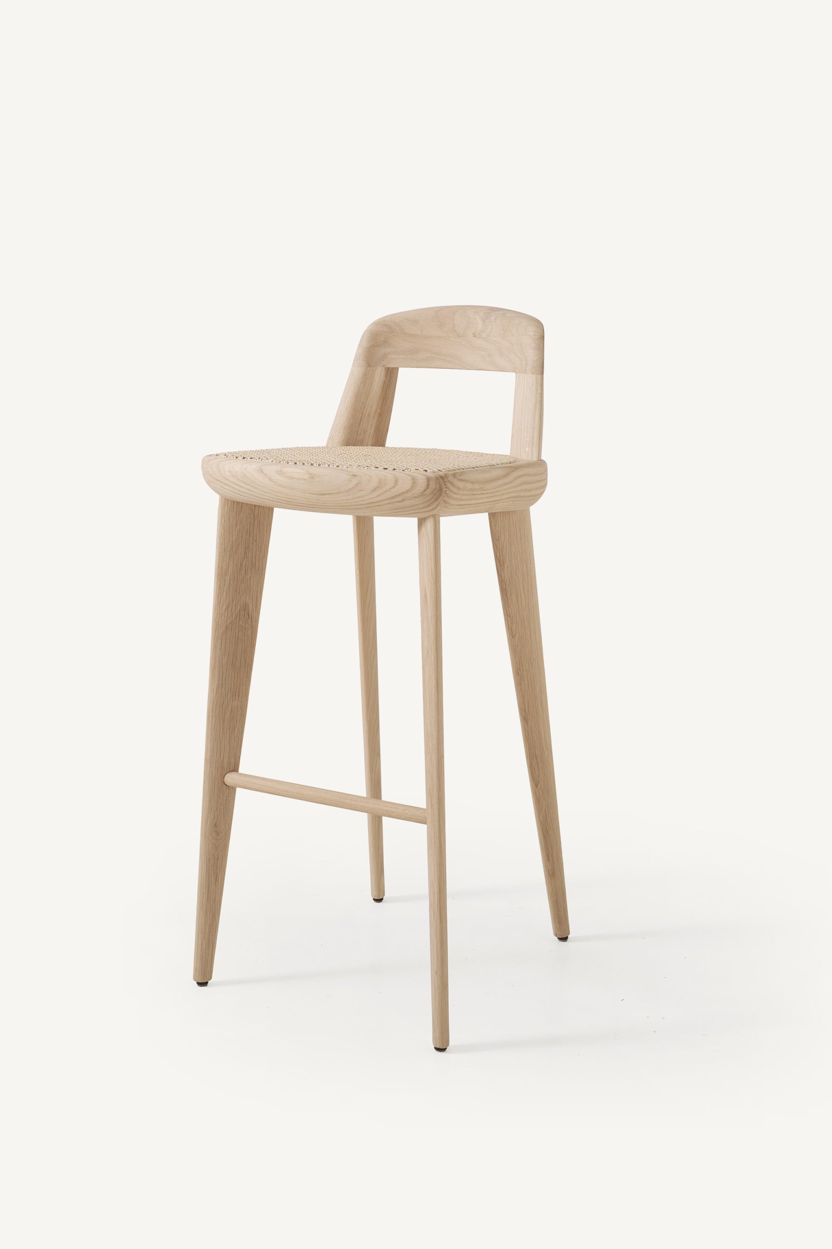 Brutus is intended to look more cut than constructed, as if it has been weathered naturally over time and then manipulated into a single sculptural element. Both the Armchair and Armless Chair versions possess certain aspects of the muscular vernacular of their Brutalist roots, but add smoothness and lightness. The Counter and Bar Stools feature the same construction details with a smaller proportioned seat and lower back. The option of Vienna caning on the seat pays homage to some of our favorite designs from the 1950s, while the upholstered version has a butter- soft leather pad with suspension webbing for maximum comfort. Each Brutus features the same style of elliptical legs which appear broad from one perspective, remarkably thin from another – similar to a shark’s fin.