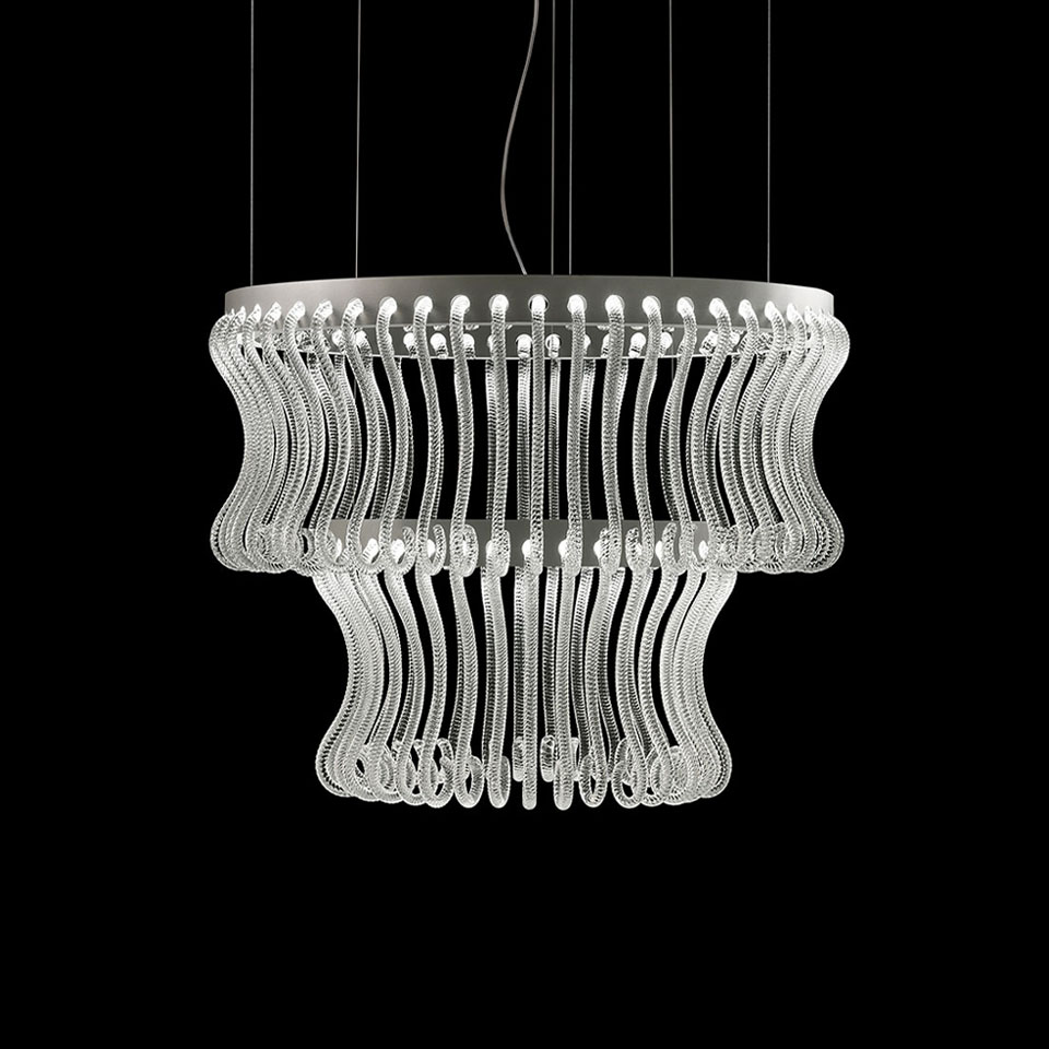 A collection that pays tribute to and enhances one of the characteristic features of the chandeliers of the Venetian tradition, the “pastorale”: a small rod terminating in a spiral, made with the “rigà menà” technique. Forcefully enlarged, suspended upside-down and replicated in a series, this piece becomes the protagonist of suspension lamps with a modern minimalist design. Available in three different configurations (one, two or three-tiers).