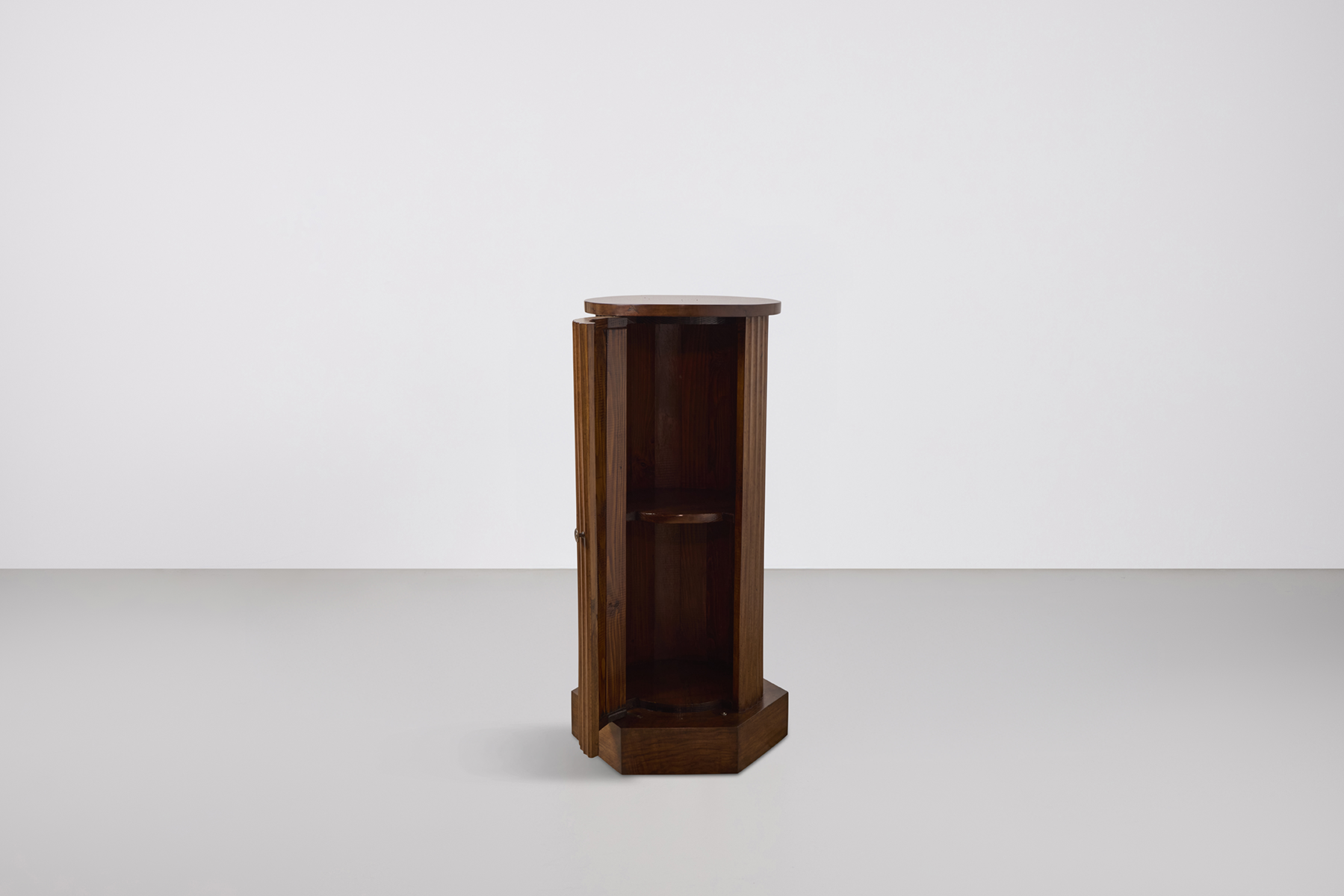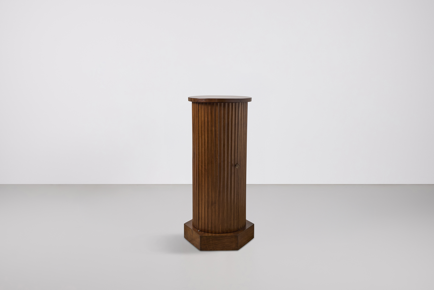 Fluted wood column with hexagonal plinth base and storage compartment.