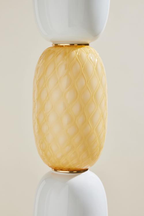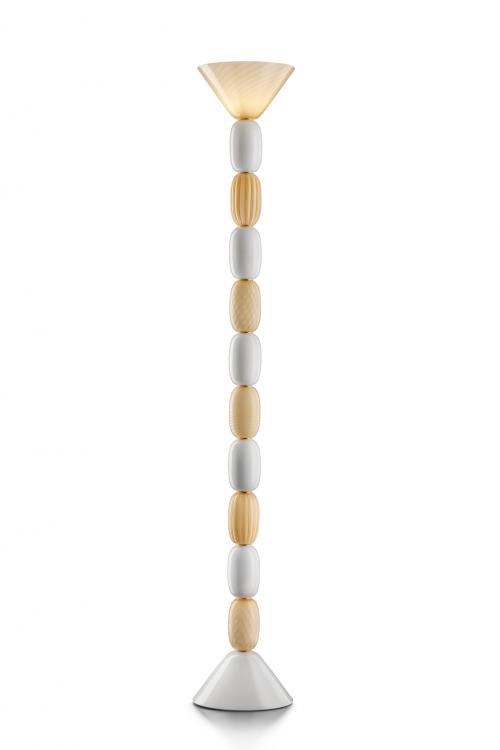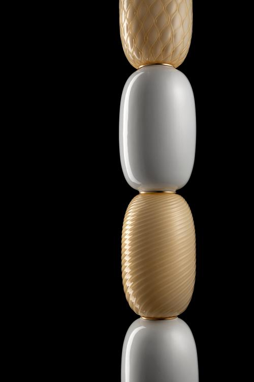 The Conterie floor lamp draws inspiration from the porcelain jewels of the Ginori 1735 Manifattura historical archive. Its structure is composed of precious hand-crafted porcelain beads and mouth-blown Venetian crystal with different textures, the result of three different craftsmanship, ballotòn, rigadìn and rigamenà. The light diffuses softly from the Murano glass cone, which takes up the symmetrical shape of the porcelain base. Like a necklace that illuminates the wearer’s face, Conterie is able to illuminate the home with its delicate light.