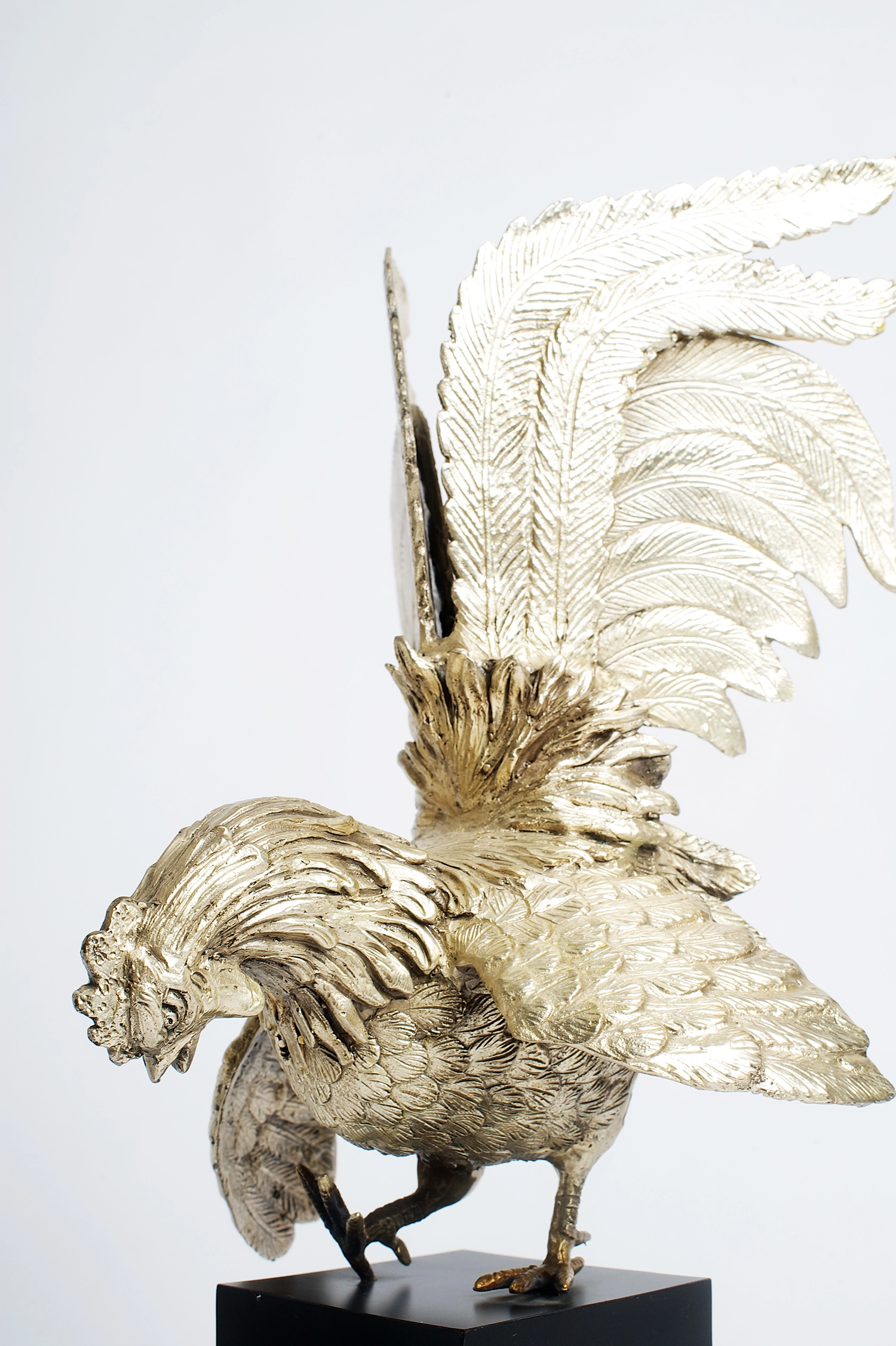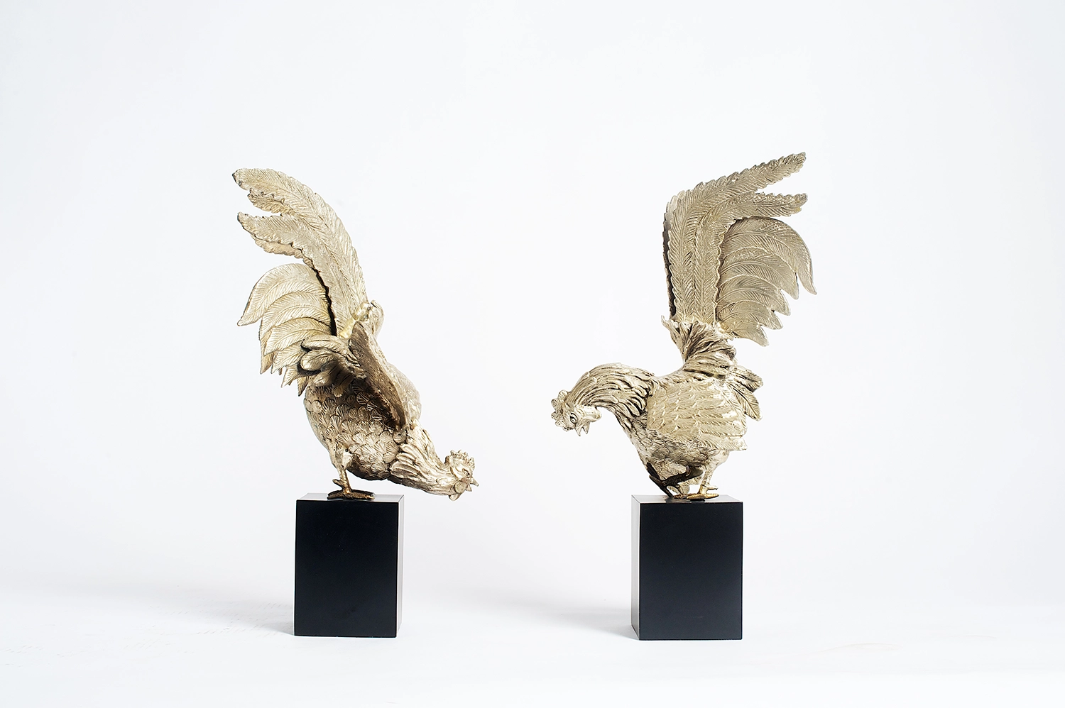 Set of 2 bronze rooster sculptures in a silver bronze finish.