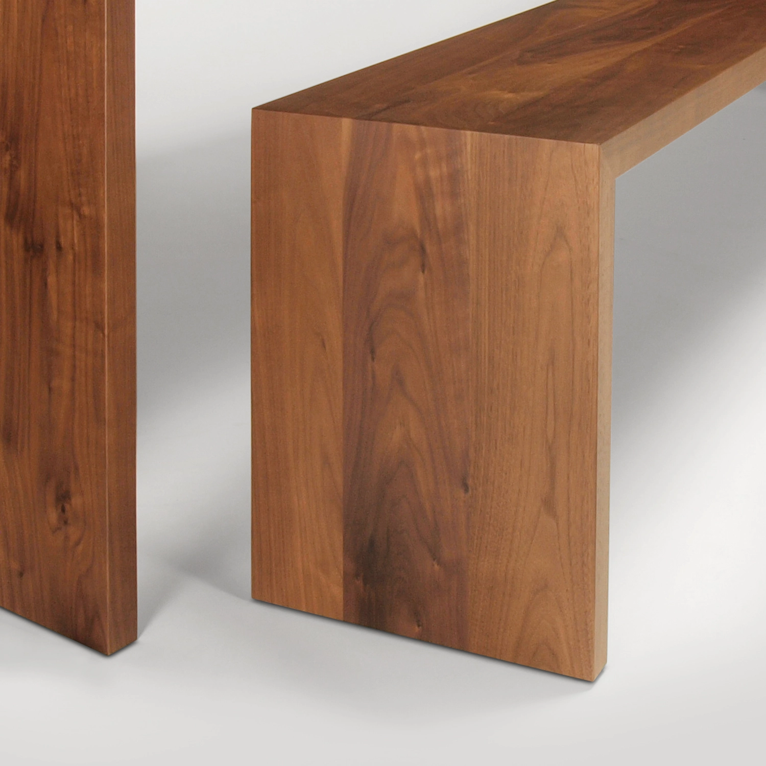 The Lineground Bench may be used independently or as a companion to the lineground community or farm tables. Features include solid timber construction throughout, mortise-and-tenon joinery, and mitered corners with matched seams/waterfall edges. Options include: Stretcher location at floor level or beneath seat (concealed). Additionally, clients may select edge profile as square or reverse bullnose. Custom materials and sizes available. Residential or contract use.