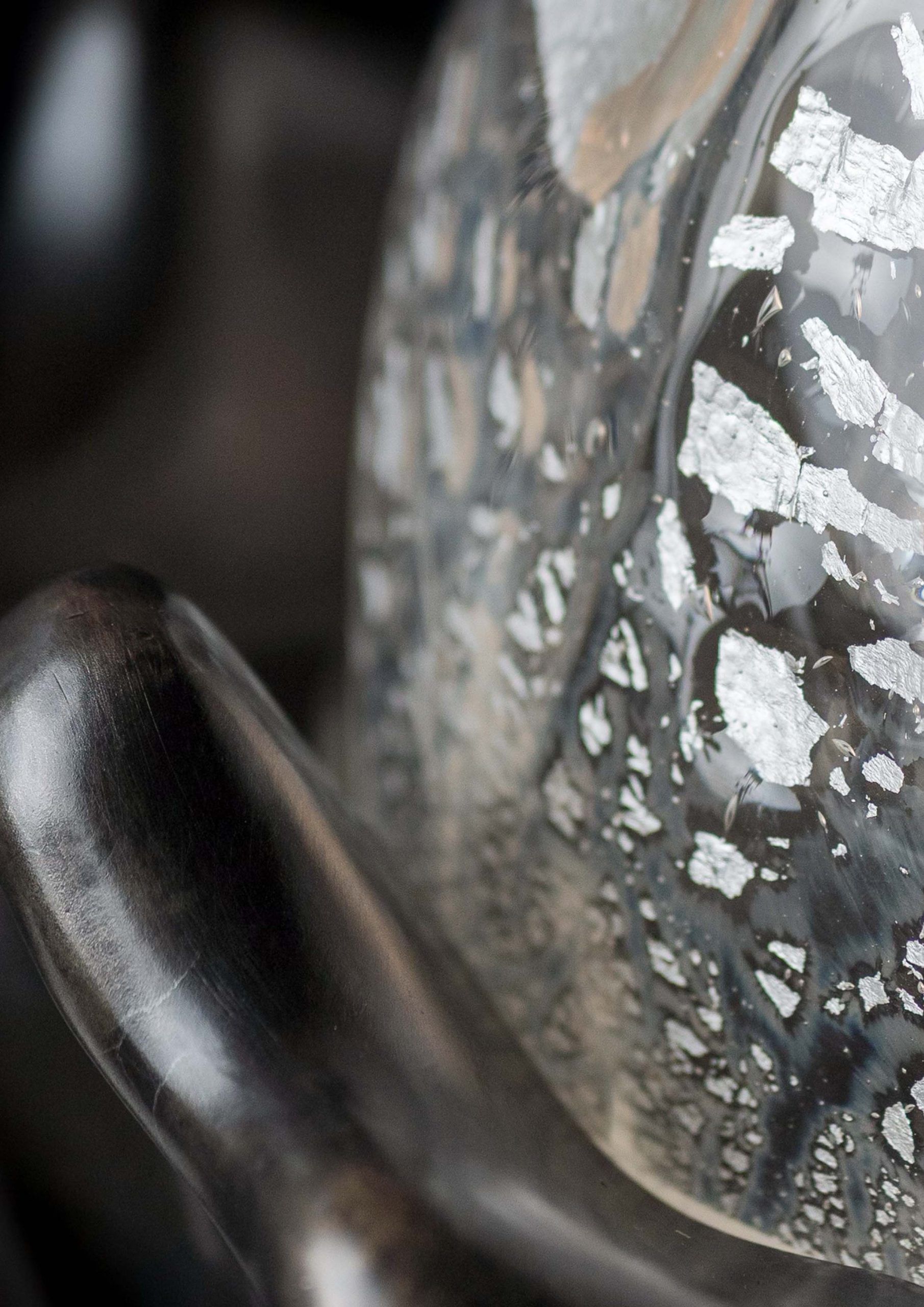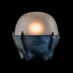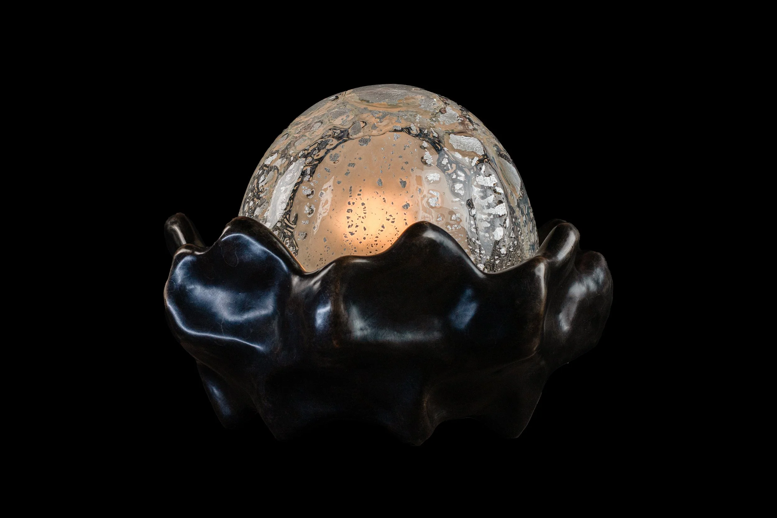 Sculpted table lamp with a cast bronze base supporting a hand-blown glass cloche, accented with sterling silver elements fused during the glassblowing process. A sandblasted inner diffuser ensures even, soft light distribution.