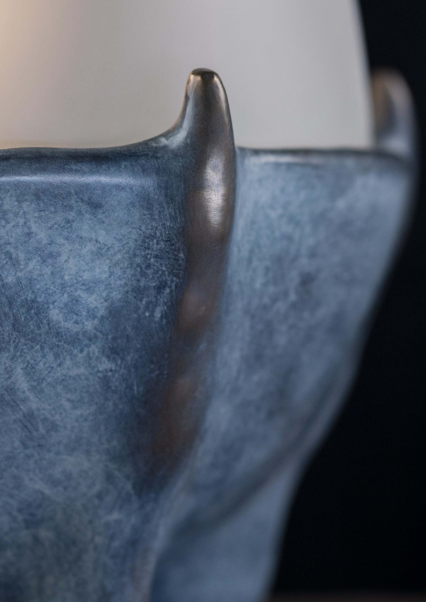 Sculpted table lamp in cast bronze, with five prongs that cradle a hand-blown glass cloche. The matte, acid-etched exterior creates a soft, ambient illumination.