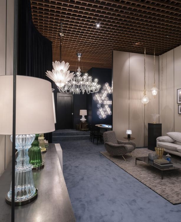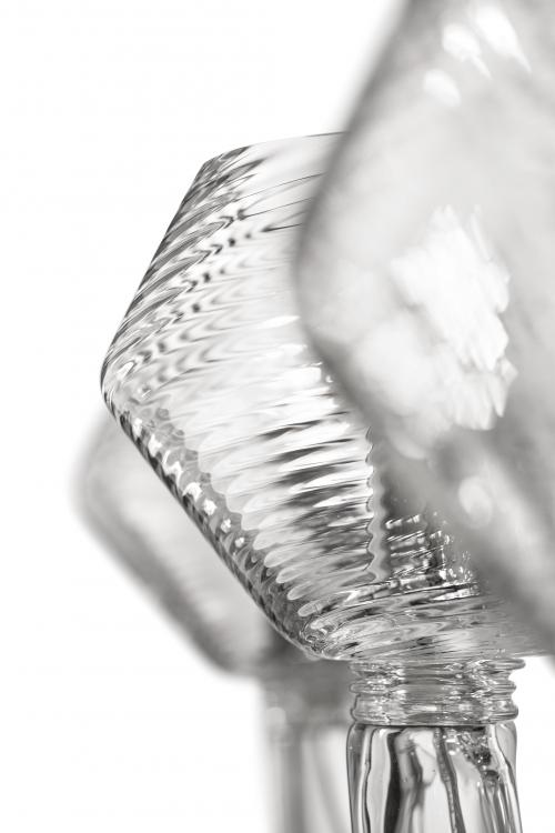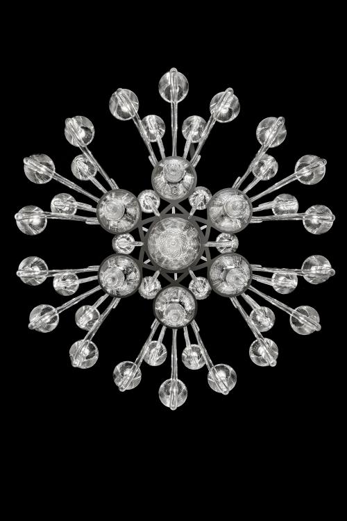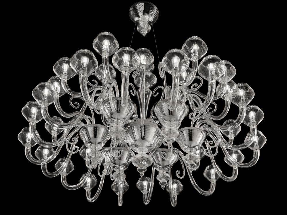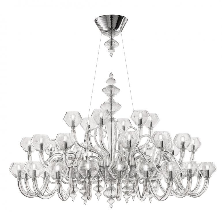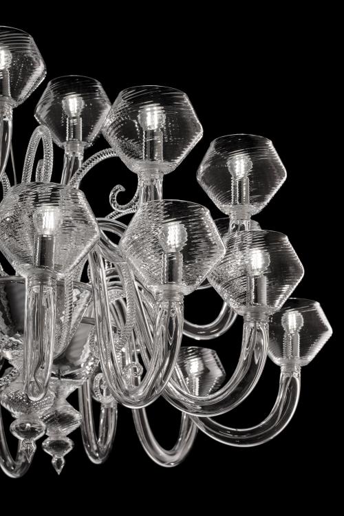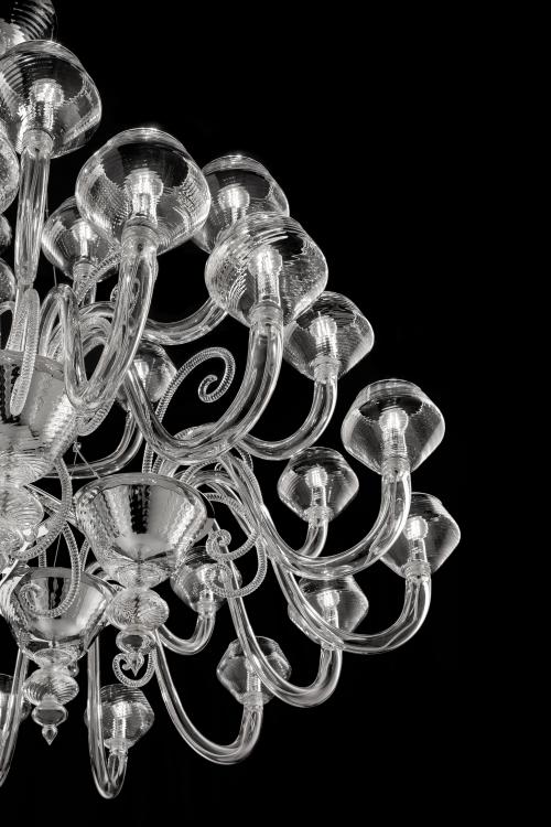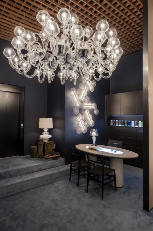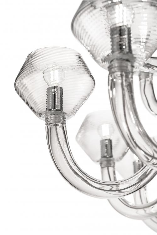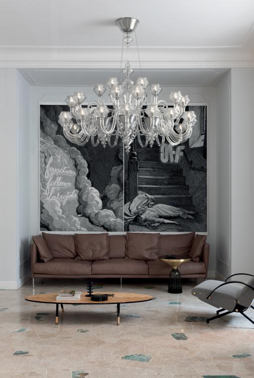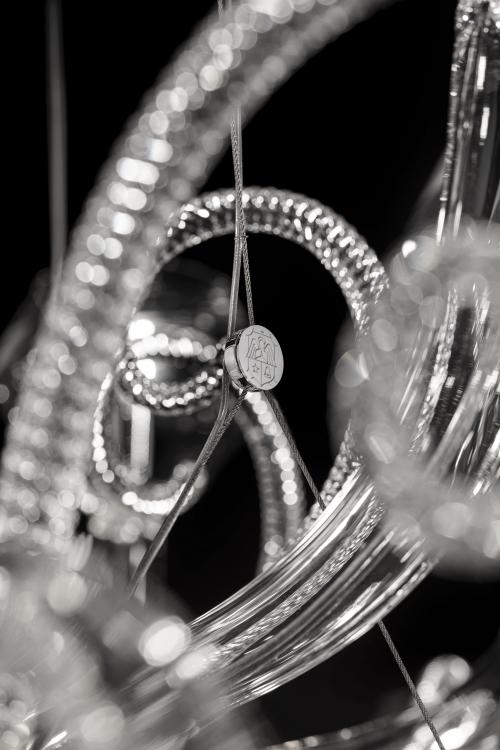 The Magritte collection is the result of a conceptual work that investigates the idea of ​​a chandelier to the point of rethinking and deconstructing it. Inspired by the surrealist language, the collection presents itself with a scenographic and elegant layout, on multiple levels, as tradition dictates, but in reality it reveals a new and avant-garde design. The classic central core with arms leaves room for a modular satellite system, conceived to be extended concentrically, like a cloud of light and blown glass.
