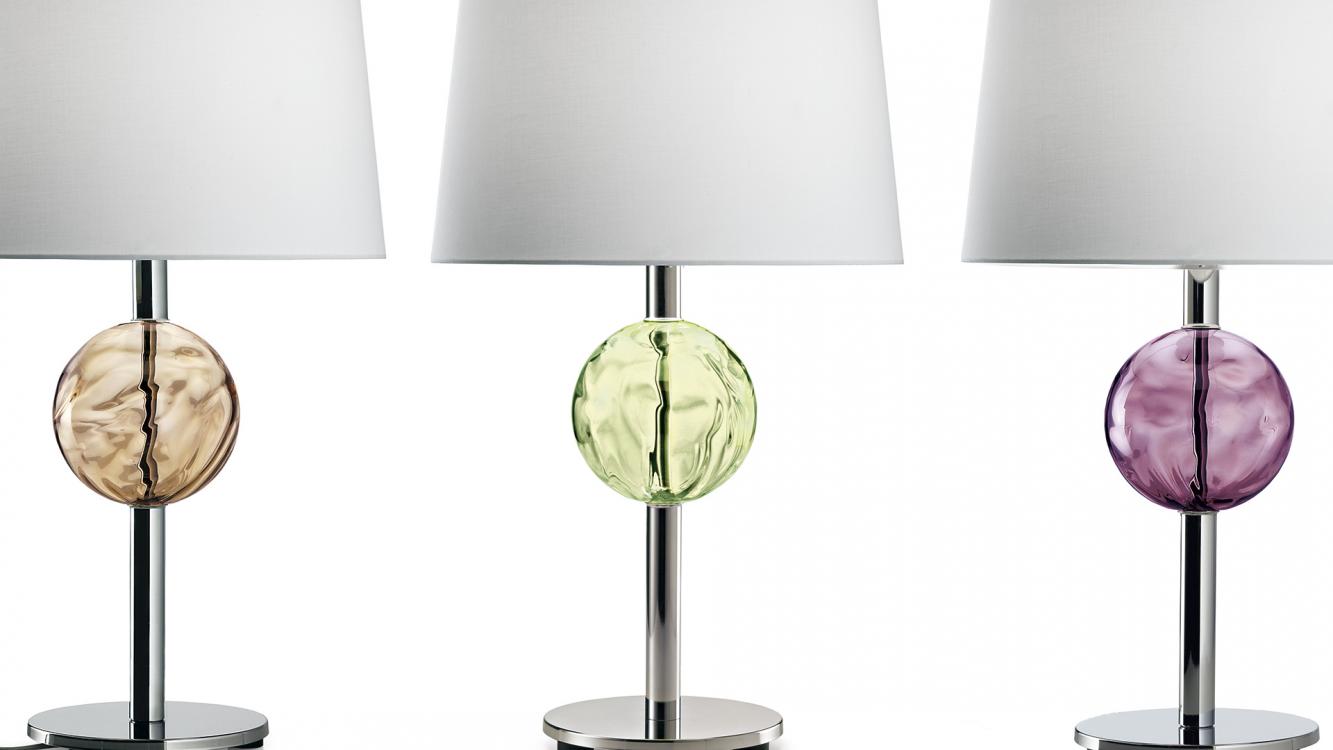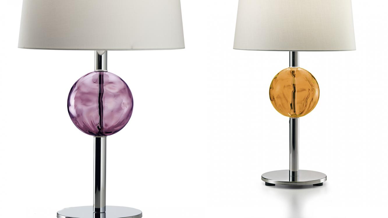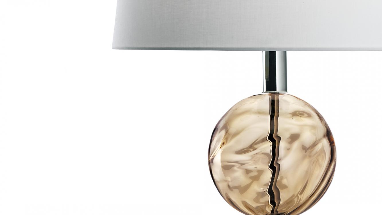 A table lamp with a very slender stem bearing a Venetian crystal sphere worked with the traditional “corteccia” technique. The hot glass is skillfully turned on a flat lamellar plate and then blown to obtain an irregular three-dimensional surface, resembling the bark of a tree.