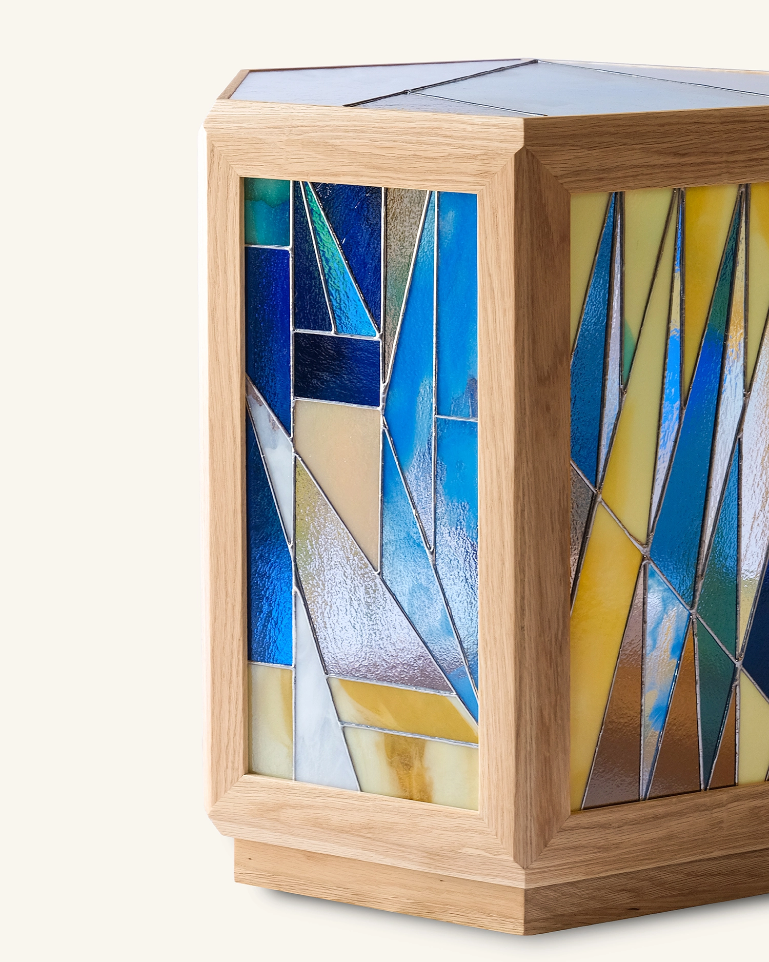 Tall side table with Oak wood base and framing with custom stained glass panels.