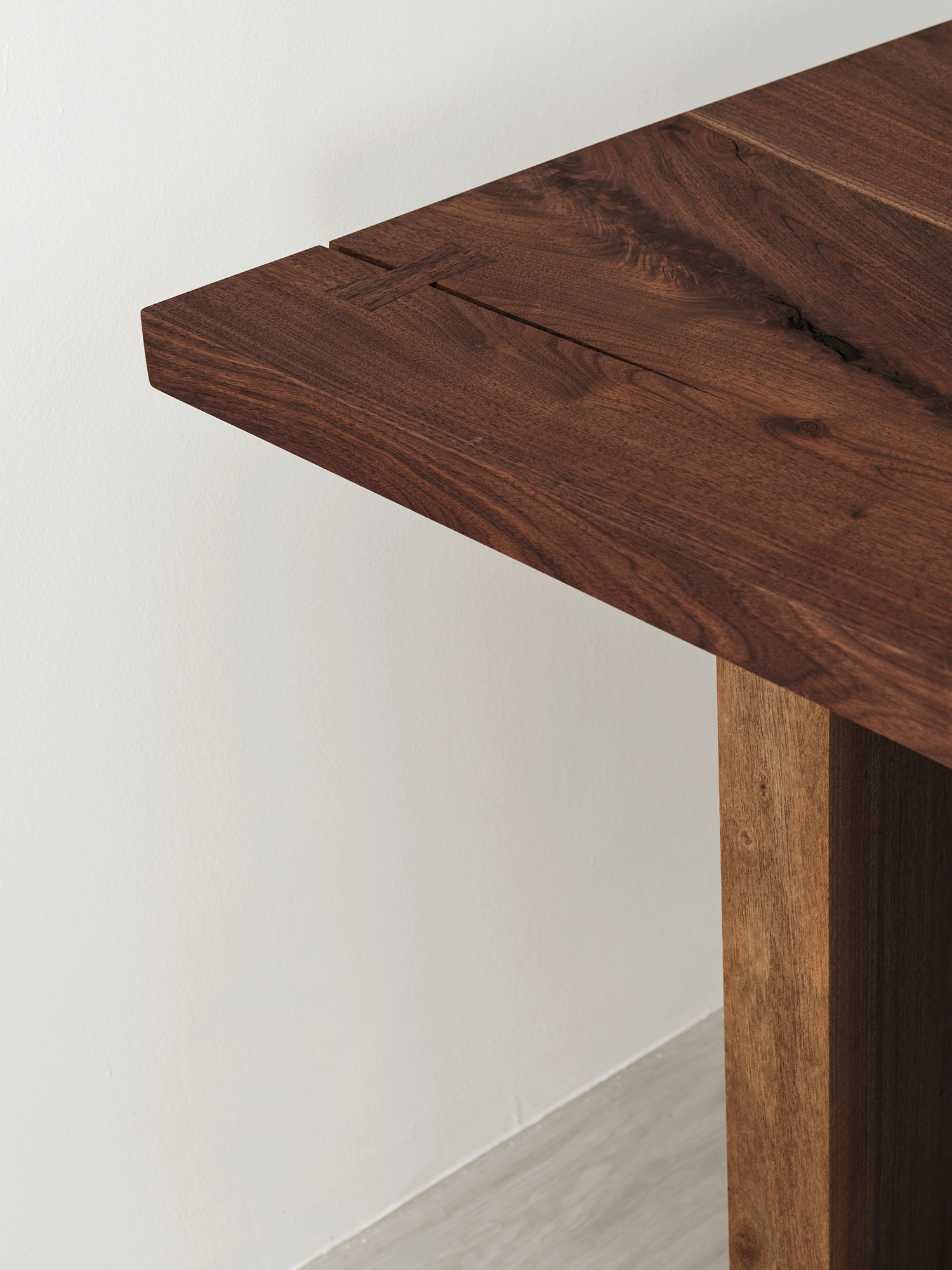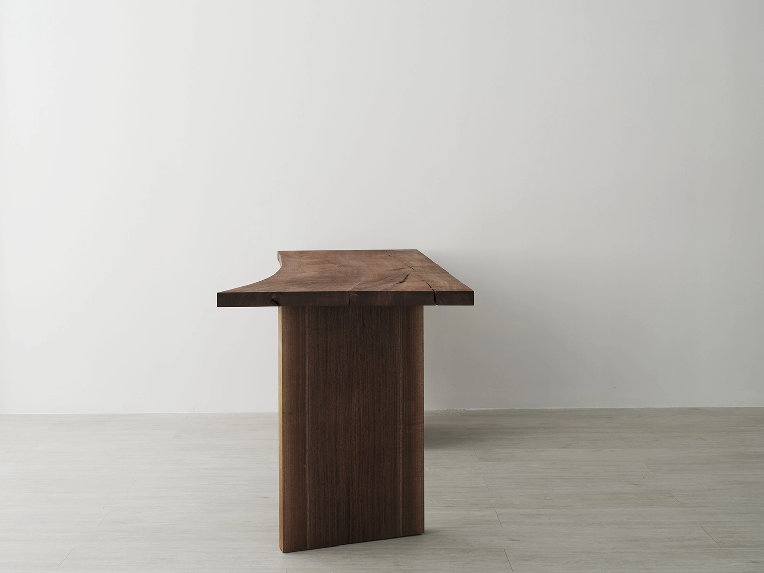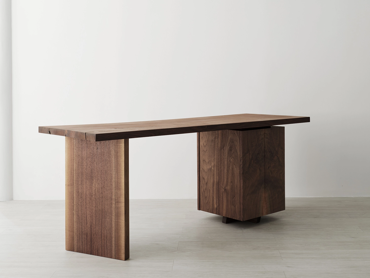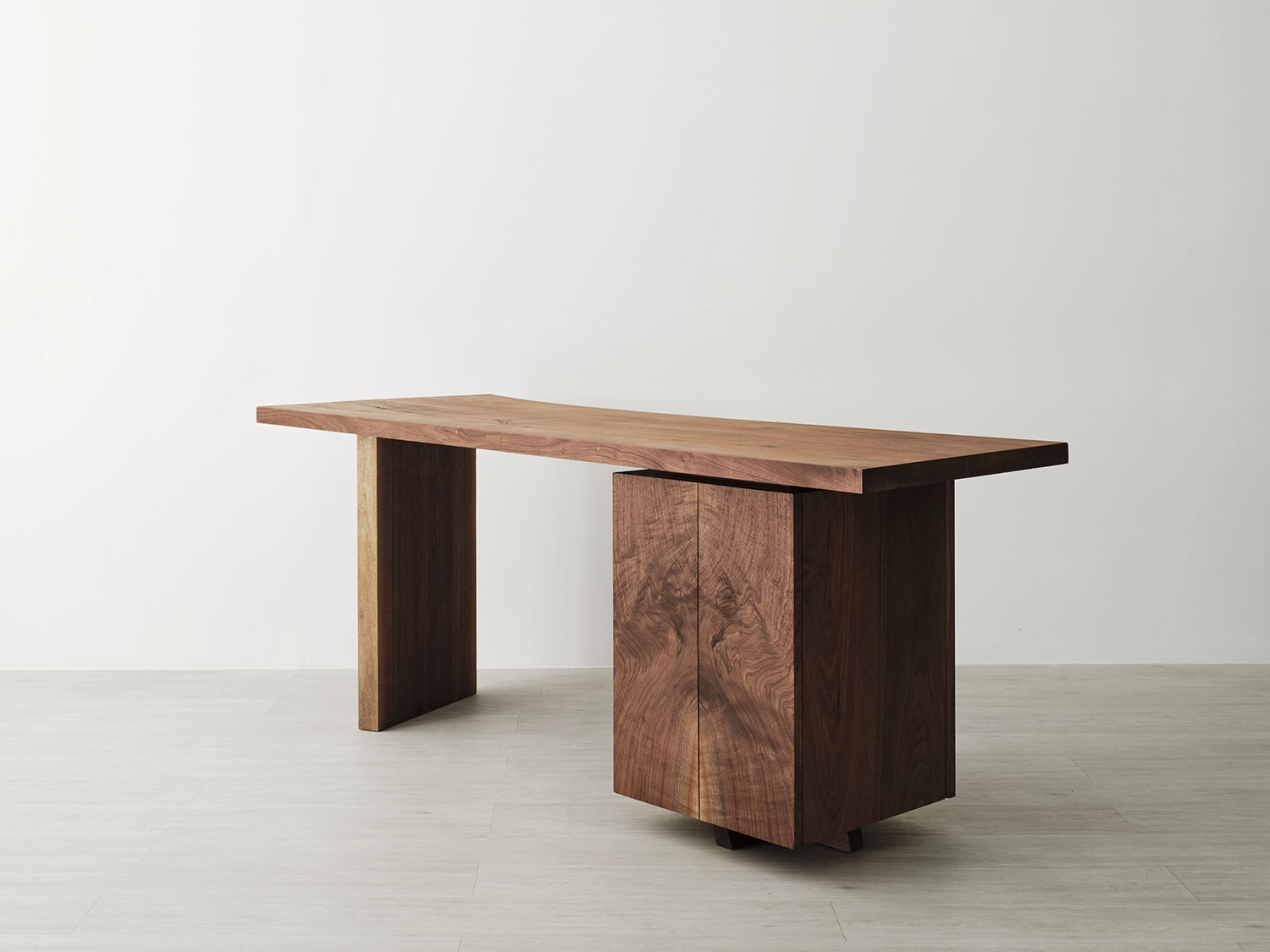 The Mira desk celebrates the natural growth of the tree from which it is crafted. The top is made from a single slab; joined and scribed to the natural curvature and graining of the tree. The front storage cabinet is a book matched piece of the crotch of the tree, a kaleidoscopic view emerging from the grain.