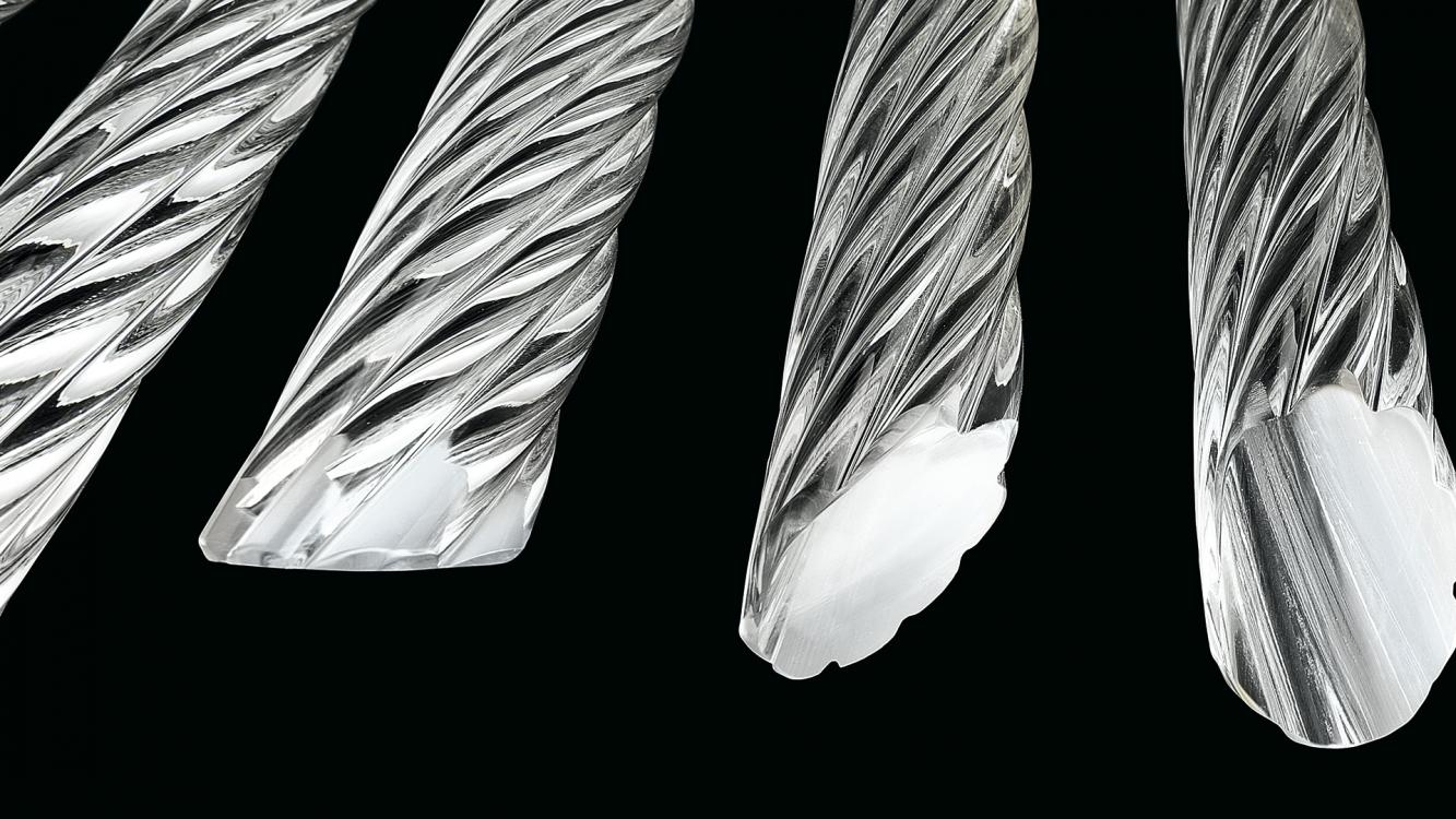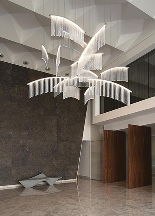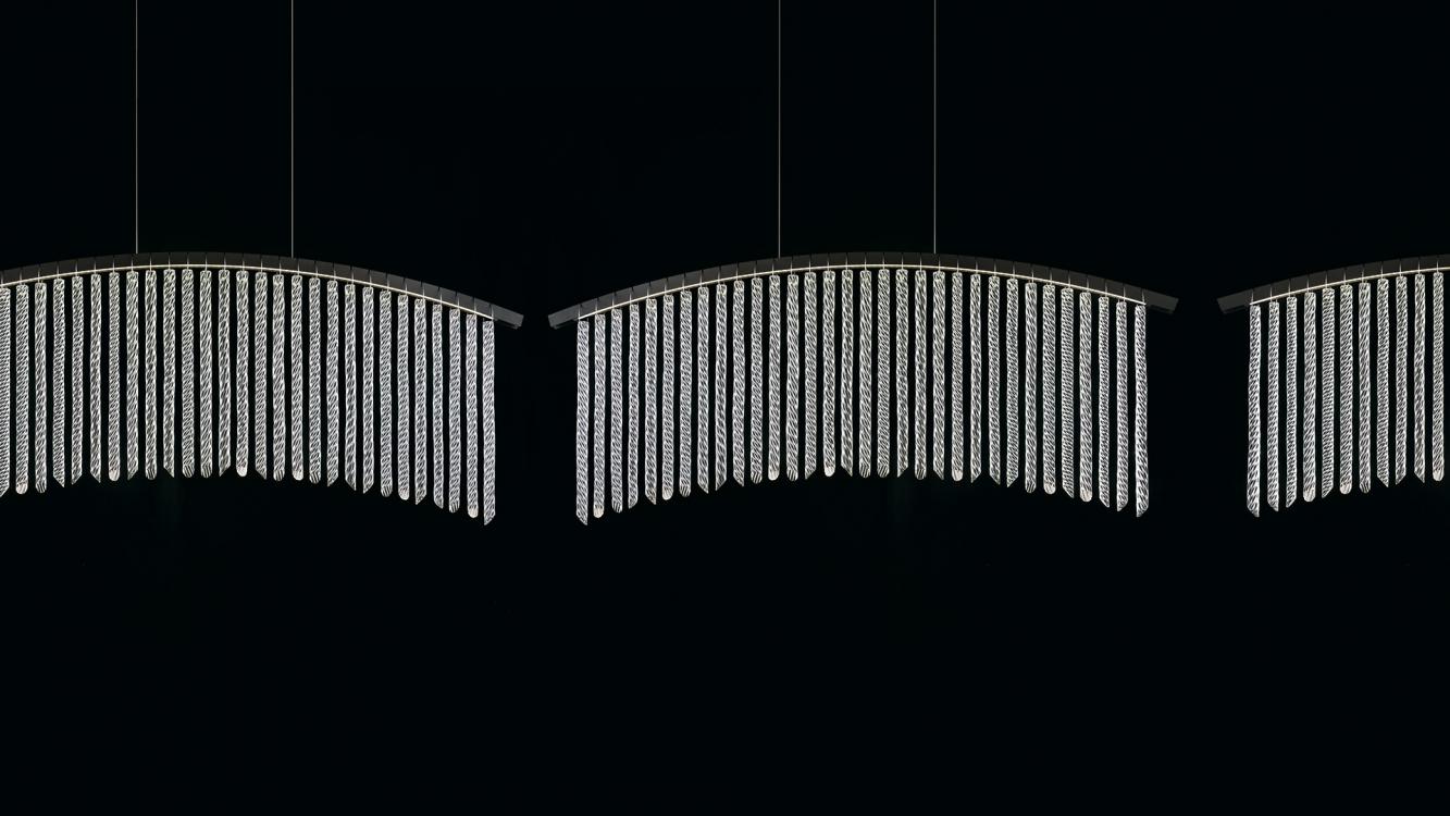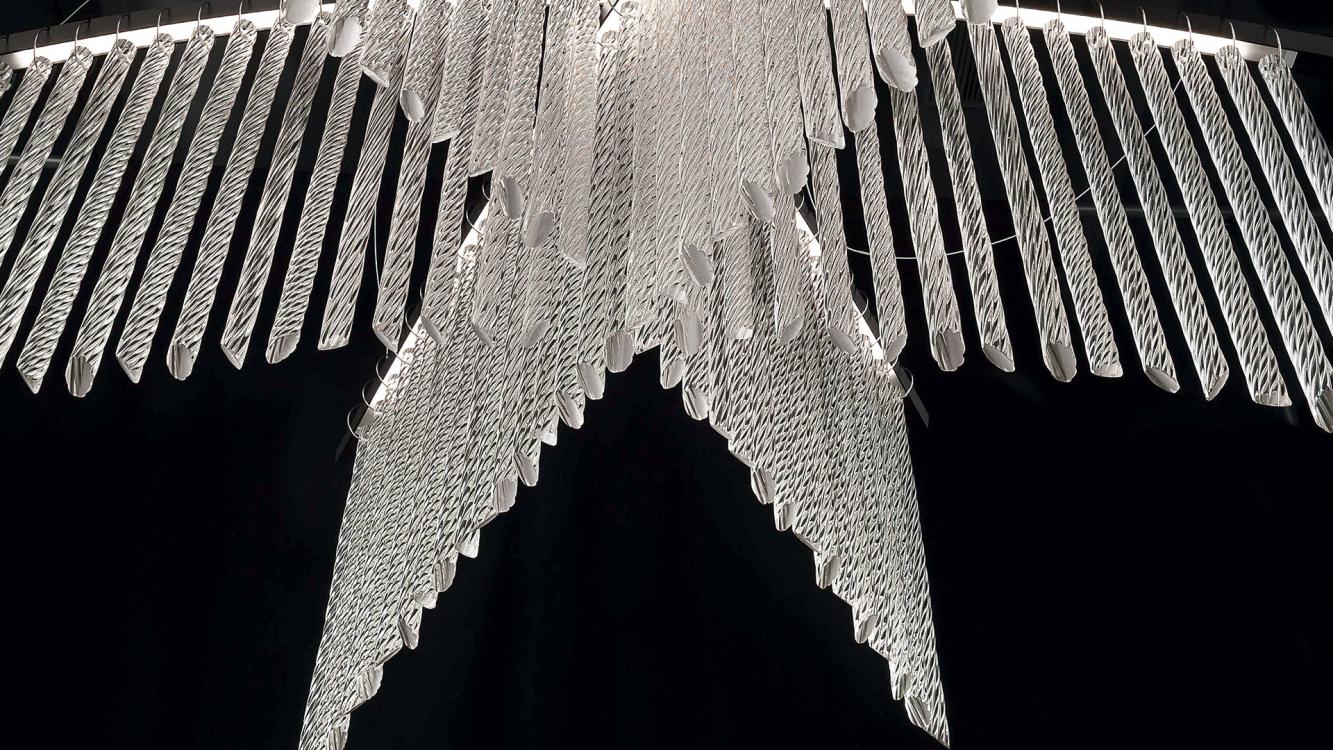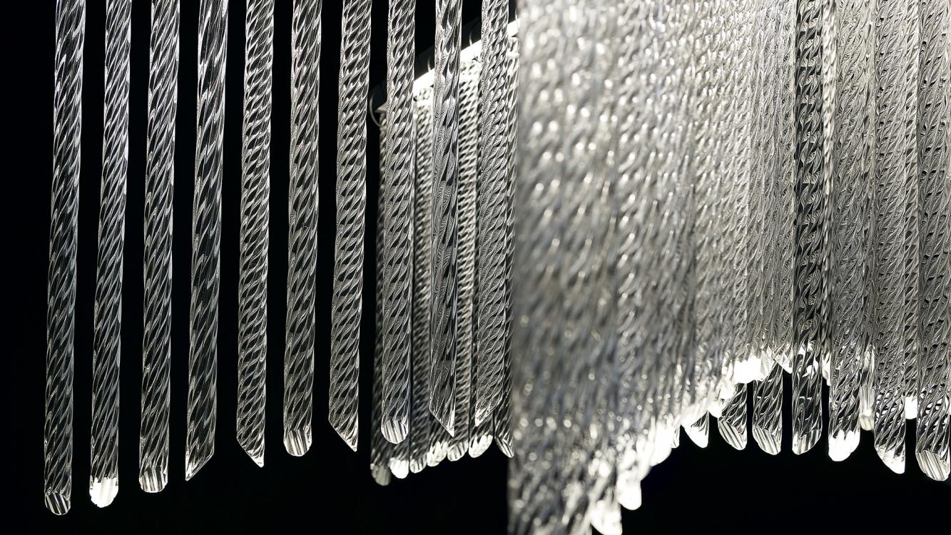 Palmyra is a very light suspension, characterized by sinuous lines, able to embellish and illuminate any environment. It is composed by overlapped arms with curved profiles, from which hang twisted crystal elements, made following the “pastoral” processing of the ancient Murano glass tradition.