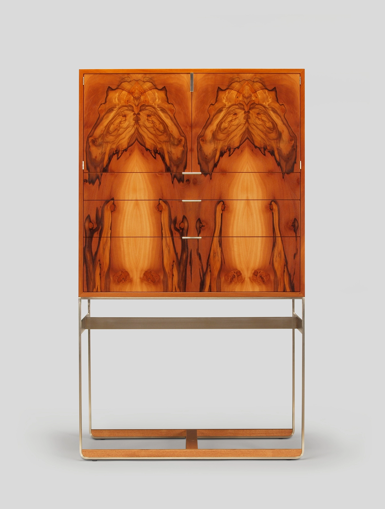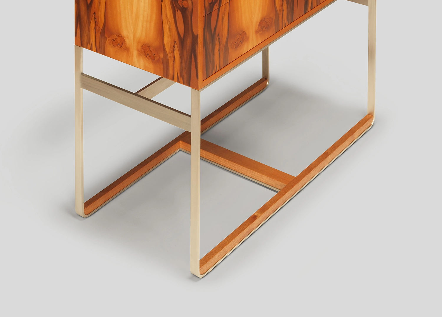 The Piedmont Chest on Stand is offered in 2 variants: Standard or Limited Edition. Both feature 2 large doors in hand-matched longwoods or burls. Construction is mitered with ‘waterfall’ edges and mortise-and-tenon joinery. All edges and corners are reinforced with solid timber for added durability. Drawers are solid timber with cork or burl-lined drawer bottoms riding on concealed runners. Doors & drawers open via low profile tab pulls in natural rubbed bronze. Doors operate via precision-machined butt hinges in bronze. 1 adjustable shelf per cabinet area. Residential or contract use.