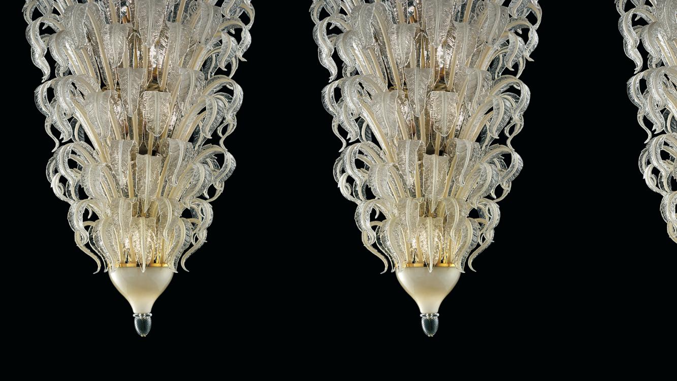 Resumed from drawings of the 20ies and 30ies from our historical archive, these suspensions pay a tribute to the Déco era. With their rich feathers they evoke luxurious and refined settings. Perfect for extremely decorated ambiences as well as, playing with contrasts, for more minimal interior design projects.